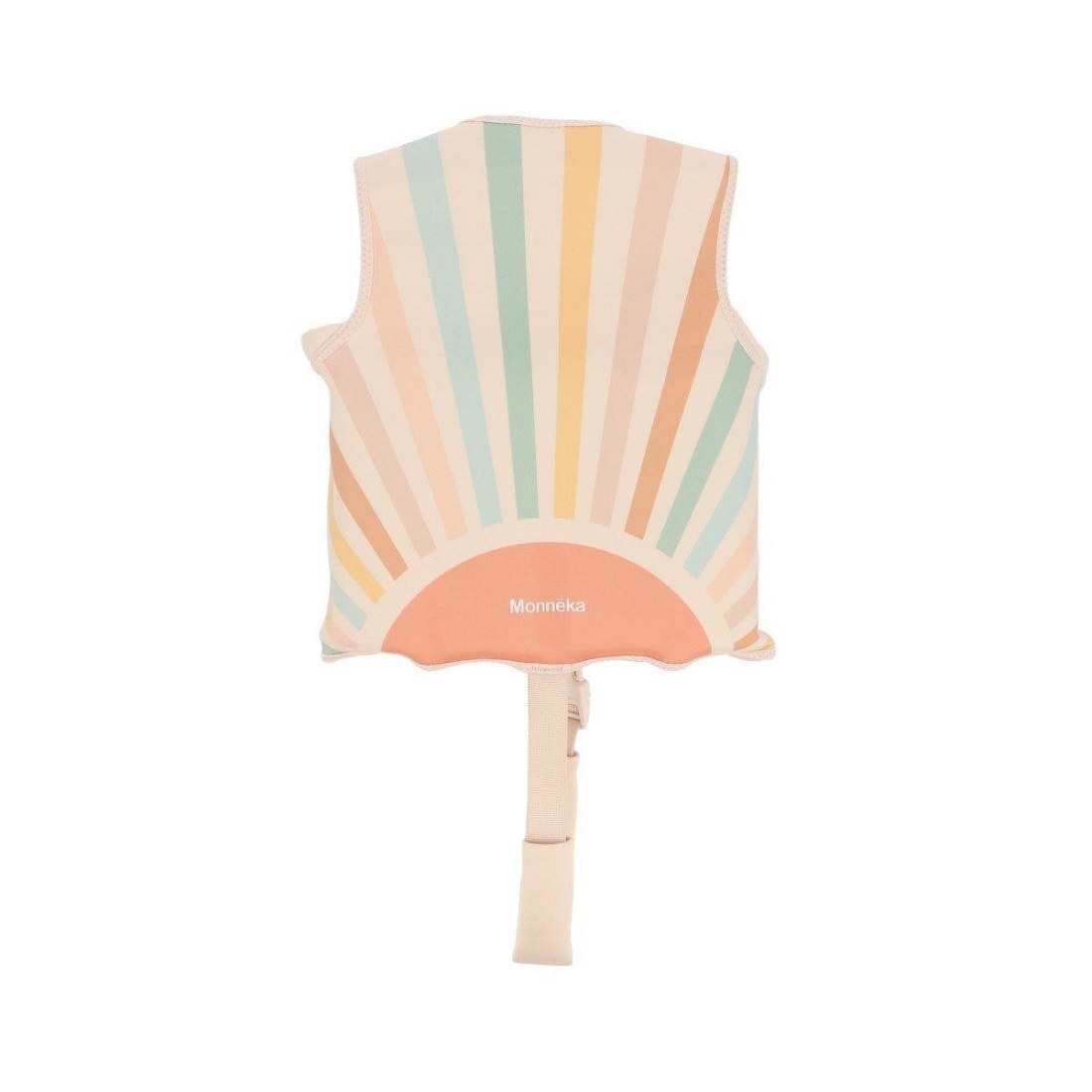 Το γιλέκο ασφαλείας Monnëka διαθέτει λουράκι με κλείσιμο ασφαλείας για να τοποθετείται ανάμεσα στα πόδια ώστε το γιλέκο να μην φεύγει πάνω από το κεφάλι, κατά τη βουτιά στο νερό, ή κατά τη διάρκεια της κολύμβησης.
