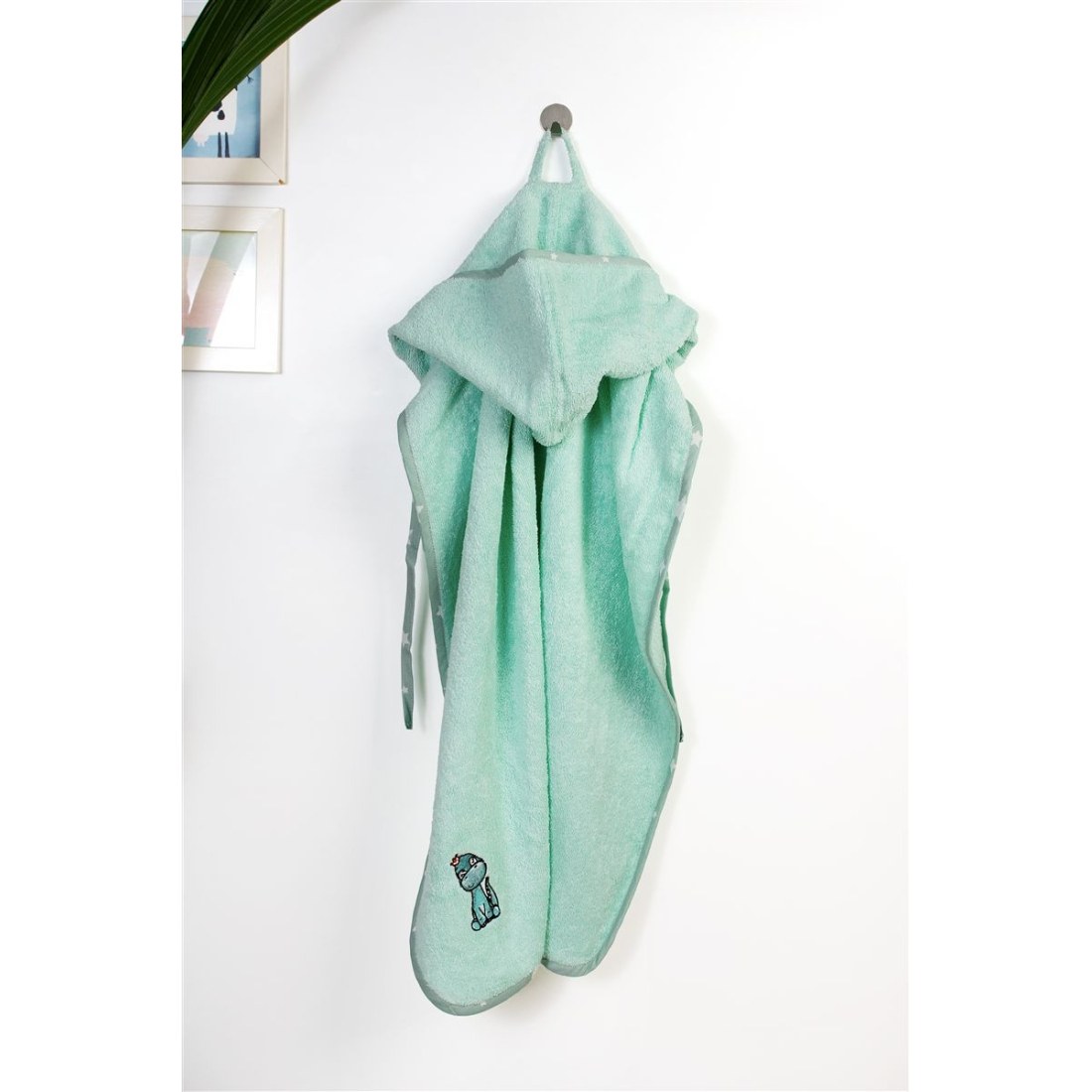 Βρεφική κάπα χρώματος μέντας διαστάσεων 75 x 85 cm. διακοσμημένη με χαριτωμένο κέντημα δεινοσαυράκι και χρωματιστό ρέλι με μοτίβο αστεράκια. Κατασκευασμένη από 100% βαμβακερή υποαλλεργική πετσέτα υψηλής απορροφητικότητας. βάρους 400 gr/m² ελεγμένη για επιβλαβείς ουσίες με το παγκοσμίως αναγνωρισμένο πιστοποιητικό. OEKO TEX® Standard 100. Η απαλή υφή της προσφέρει την ιδανική φροντίδα. ενώ η ενσωματωμένη κουκούλα κρατάει το κεφαλάκι του μωρού ζεστό. Συσκευασία δώρου: κουτί πολυτελείας.