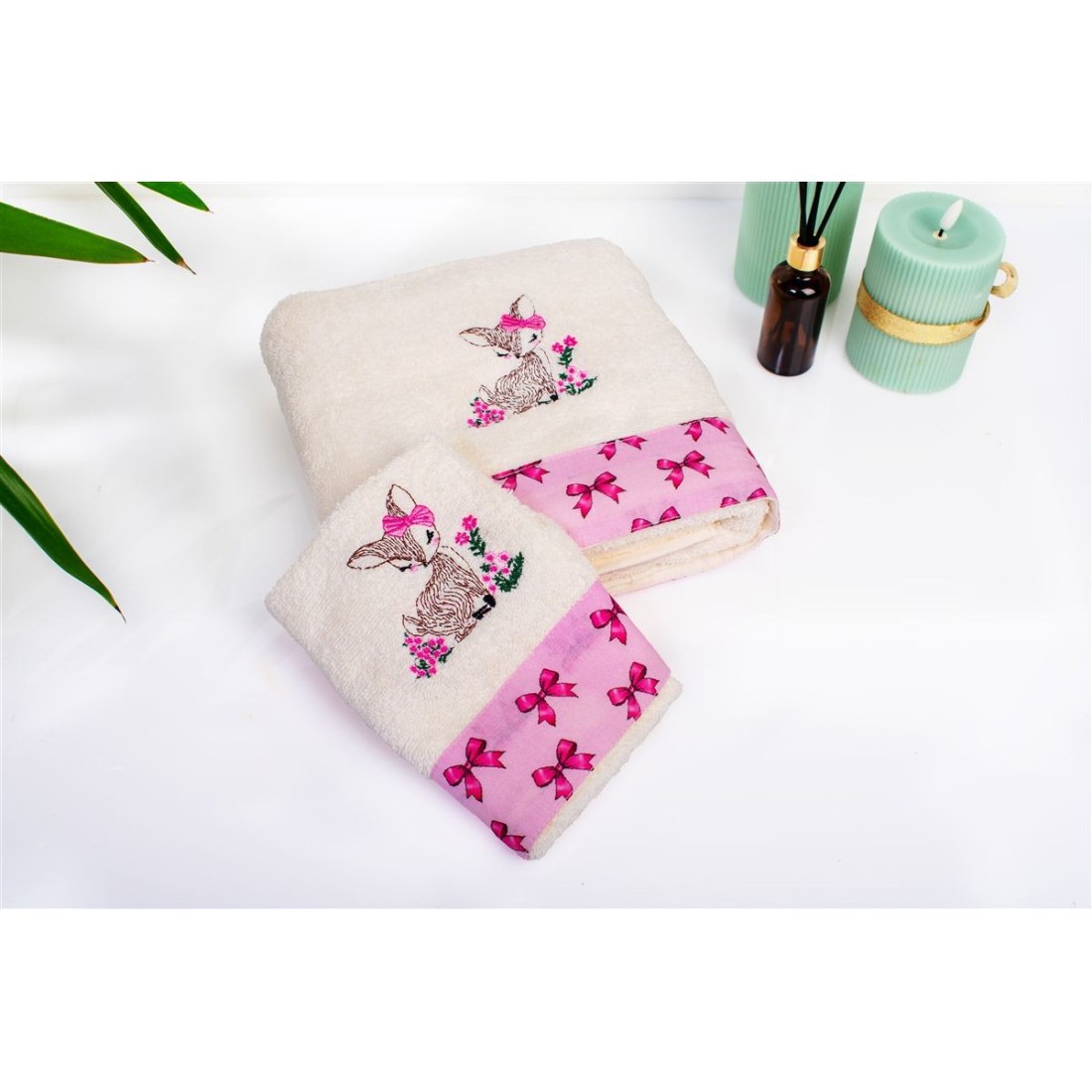 Βρεφικό σετ πετσέτες 2 τεμαχίων χρώματος εκρού το οποίο περίεχει: 1 πετσέτα χειρός/προσώπου διαστάσεων 30 x 50 cm και 1 πετσέτα μπανίου διαστάσεων 70 x 140 cm. Οι πετσέτες είναι διακοσμημένες με χαριτωμένο κέντημα ελαφάκι και χρωματιστή φάσα με μοτίβο κορδελίτσες. Κατασκευασμένη από 100% βαμβακερή υποαλλεργική πετσέτα υψηλής απορροφητικότητας. βάρους 400 gr/m² ελεγμένη για επιβλαβείς ουσίες με το παγκοσμίως αναγνωρισμένο πιστοποιητικό. OEKO TEX® Standard 100. Η απαλή υφή τους προσφέρει την ιδανική φροντίδα για το μωρό. από τις πρώτες του μέρες. Συσκευασία δώρου: κουτί πολυτελείας.