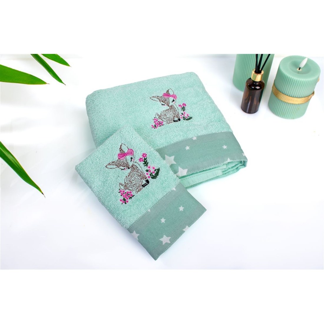 Βρεφικό σετ πετσέτες 2 τεμαχίων χρώματος μέντας το οποίο περίεχει: 1 πετσέτα χειρός/προσώπου διαστάσεων 30 x 50 cm και 1 πετσέτα μπανίου διαστάσεων 70 x 140 cm. Οι πετσέτες είναι διακοσμημένες με χαριτωμένο κέντημα ελαφάκι και χρωματιστή φάσα με μοτίβο αστεράκια. Κατασκευασμένη από 100% βαμβακερή υποαλλεργική πετσέτα υψηλής απορροφητικότητας. βάρους 400 gr/m² ελεγμένη για επιβλαβείς ουσίες με το παγκοσμίως αναγνωρισμένο πιστοποιητικό. OEKO TEX® Standard 100. Η απαλή υφή τους προσφέρει την ιδανική φροντίδα για το μωρό. από τις πρώτες του μέρες. Συσκευασία δώρου: κουτί πολυτελείας.