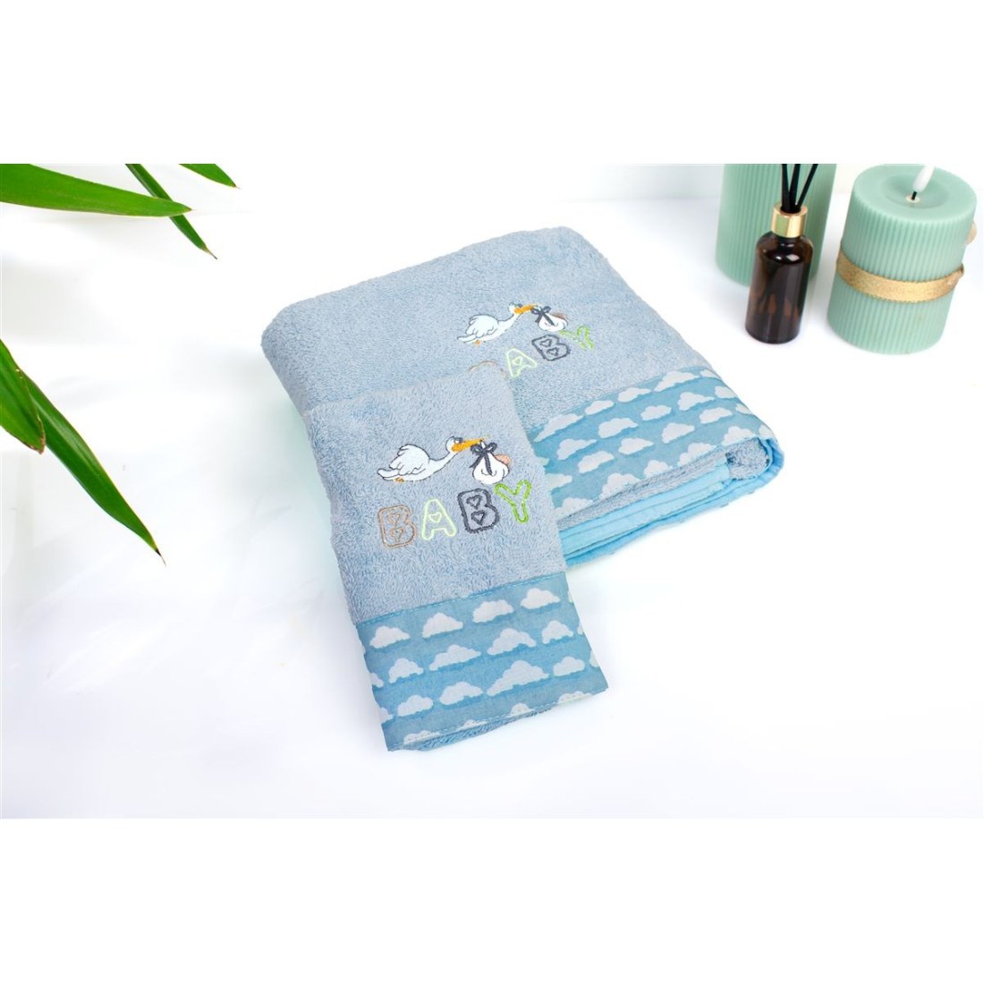 Βρεφικό σετ πετσέτες 2 τεμαχίων χρώματος σιελ το οποίο περίεχει: 1 πετσέτα χειρός/προσώπου διαστάσεων 30 x 50 cm και 1 πετσέτα μπανίου διαστάσεων 70 x 140 cm. Οι πετσέτες είναι διακοσμημένες με χαριτωμένο κέντημα πελαργό και χρωματιστή φάσα με μοτίβο συννεφάκια. Κατασκευασμένη από 100% βαμβακερή υποαλλεργική πετσέτα υψηλής απορροφητικότητας. βάρους 400 gr/m² ελεγμένη για επιβλαβείς ουσίες με το παγκοσμίως αναγνωρισμένο πιστοποιητικό. OEKO TEX® Standard 100. Η απαλή υφή τους προσφέρει την ιδανική φροντίδα για το μωρό. από τις πρώτες του μέρες. Συσκευασία δώρου: κουτί πολυτελείας.