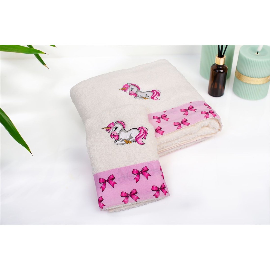 Βρεφικό σετ πετσέτες 2 τεμαχίων χρώματος εκρού το οποίο περίεχει: 1 πετσέτα χειρός/προσώπου διαστάσεων 30 x 50 cm και 1 πετσέτα μπανίου διαστάσεων 70 x 140 cm. Οι πετσέτες είναι διακοσμημένες με χαριτωμένο κέντημα μονόκερο και χρωματιστή φάσα με μοτίβο κορδελίτσες. Κατασκευασμένη από 100% βαμβακερή υποαλλεργική πετσέτα υψηλής απορροφητικότητας. βάρους 400 gr/m² ελεγμένη για επιβλαβείς ουσίες με το παγκοσμίως αναγνωρισμένο πιστοποιητικό. OEKO TEX® Standard 100. Η απαλή υφή τους προσφέρει την ιδανική φροντίδα για το μωρό. από τις πρώτες του μέρες. Συσκευασία δώρου: κουτί πολυτελείας.