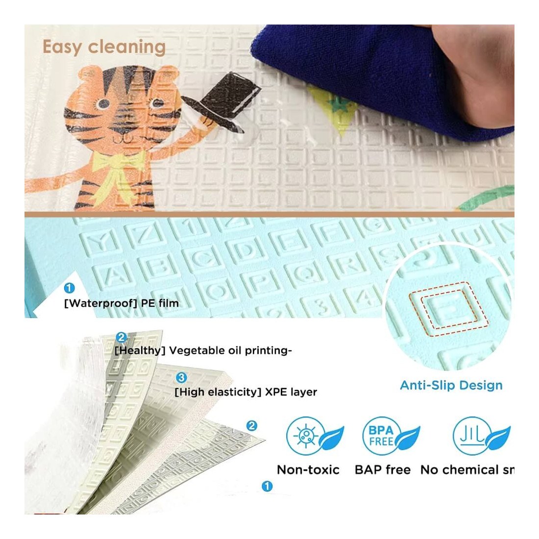 -Χάρη στην αντιολισθητική του επίστρωση, το στρώμα παραμένει σταθερό και δεν γλιστράει. Είναι, επίσης, αδιάβροχο, το μωρό σας μπορεί να φάει και να πιει πάνω του χωρίς να ανησυχείτε..