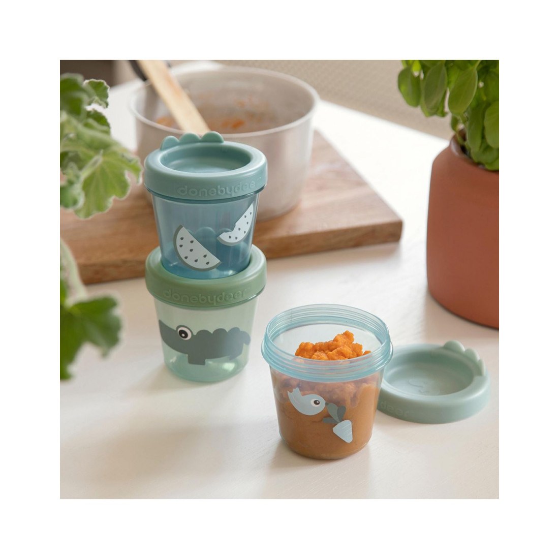 Χρησιμοποιήστε αυτό το πρακτικό σετ τριών δοχείων φαγητού για παιδικές τροφές και αφήστε ένα ελαφάκι- φίλο της Done by Deer να προσέχει τα καλούδια του μικρού σας μέσα