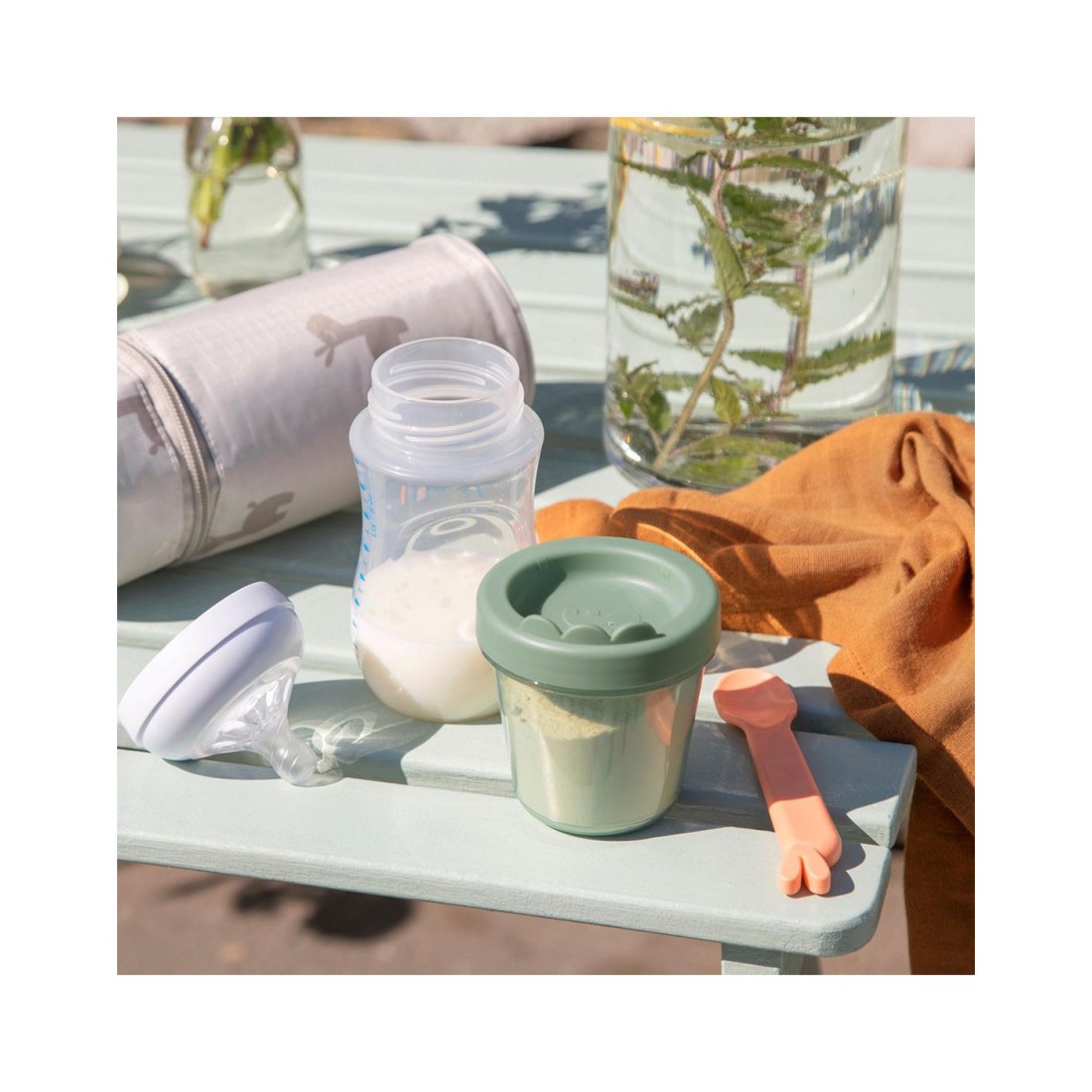 Τα δοχεία παιδικής τροφής σε αποχρώσεις του πράσινου έχουν διαφορετικά σχέδια. Το ένα έχει με την Birdee να πετάει με ένα καρότο, το άλλο με τον Ozzo να ψάχνει για σνακ και το τρίτο με καρπούζι