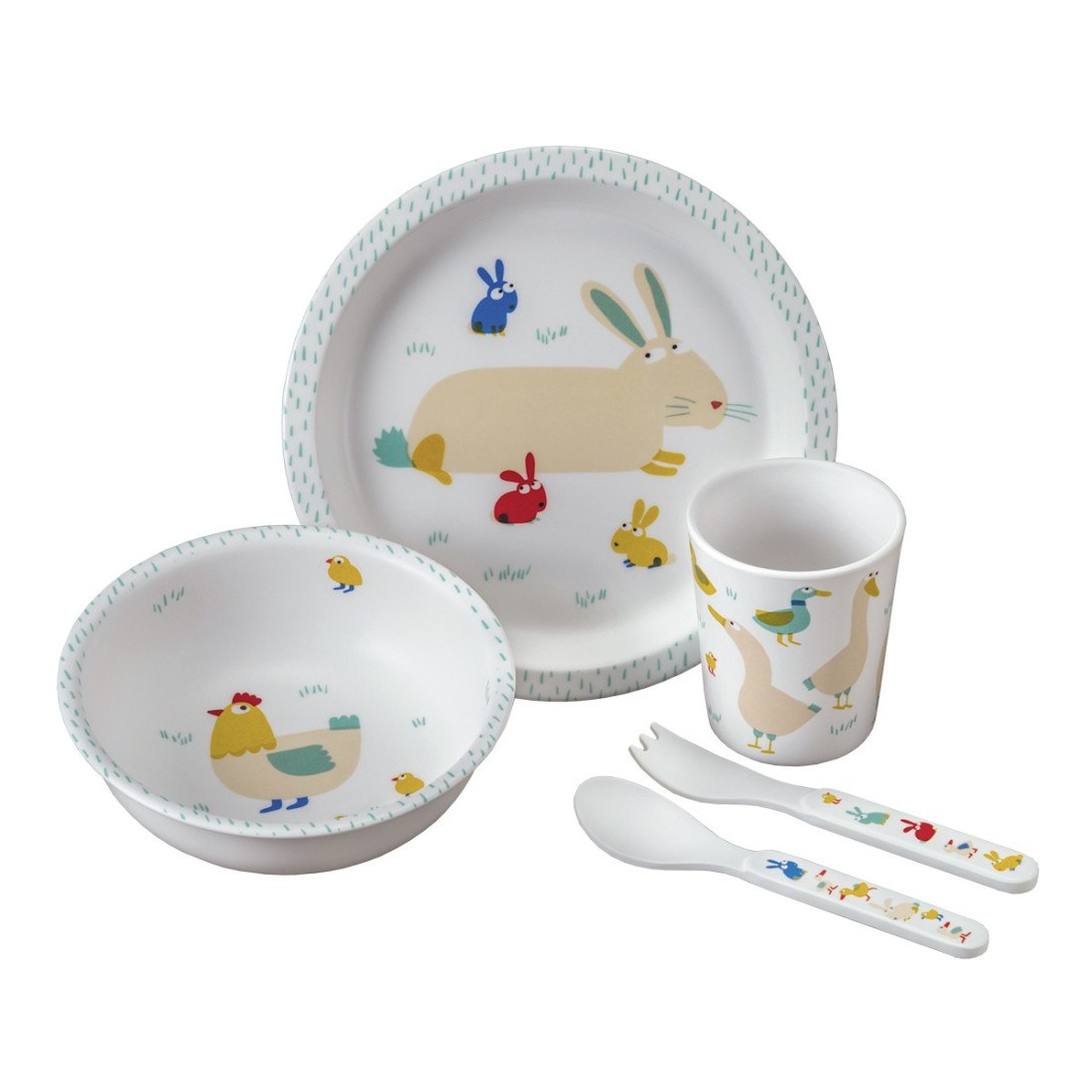 Αυτό το σετ δώρου 5 τεμαχίων περιλαμβάνει όλα όσα χρειάζεται ένα παιδί για να έχει ένα ευχάριστο και ασφαλές γεύμα: ένα πιάτο, ένα μπολ, ένα σετ μαχαιροπήρουνων 2 τεμαχίων και ένα ποτήρι.