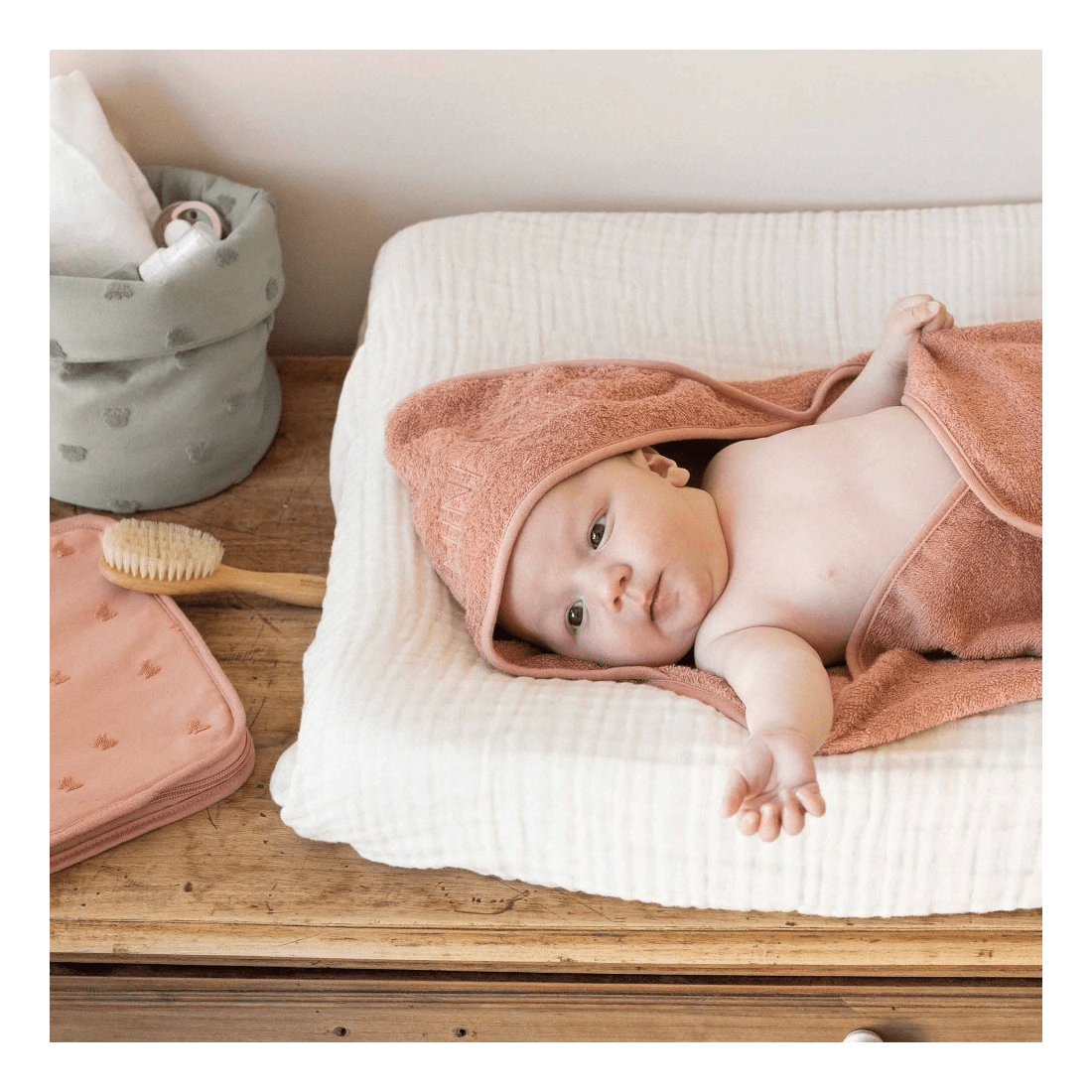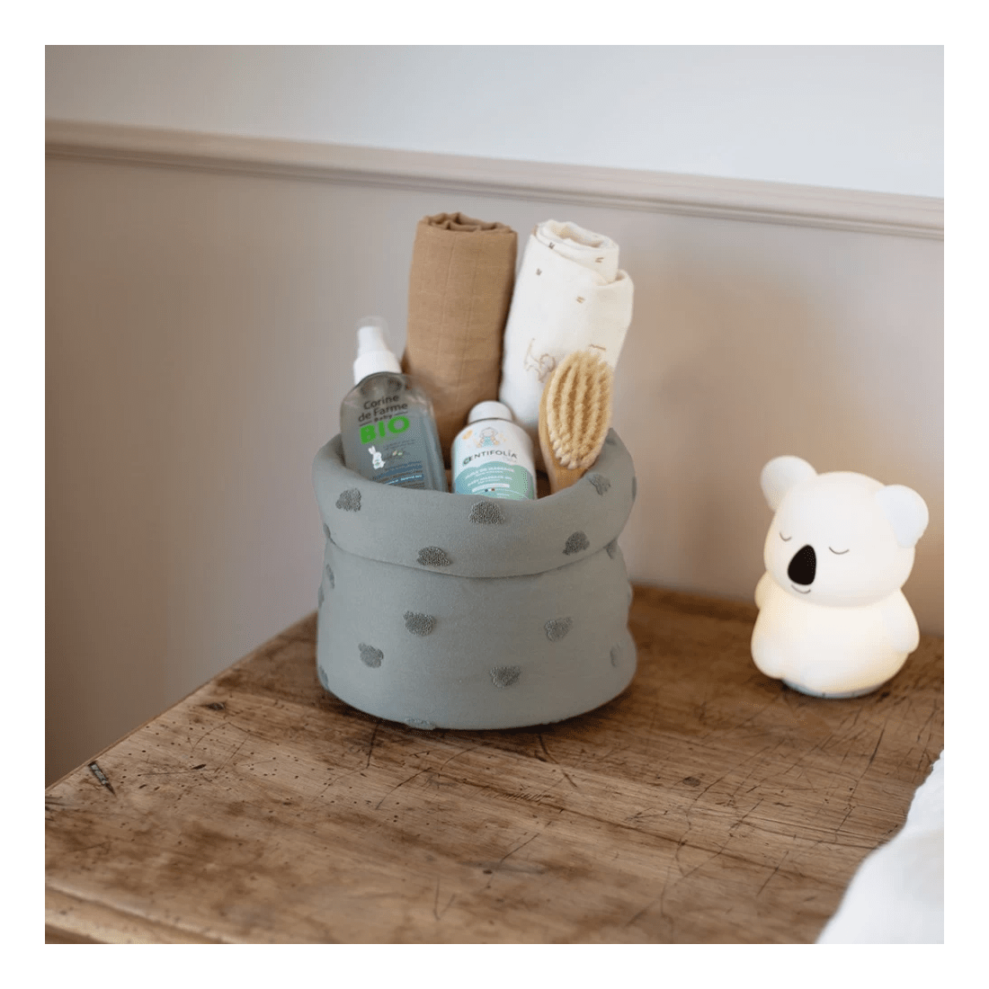Οργανώστε και τακτοποιήστε τον χώρο περιποίησης του μωρού σας με ένα όμορφο και ευρύχωρο καλαθάκι αποθήκευσης. Απαραίτητο για να διευκολύνει την καθημερινότητα των νέων γονιών, έχει σχεδιαστεί για να χωράει όλα τα απαραίτητα είδη φροντίδας και καθαρισμού του μωρού σας. Το ευρύχωρο σχήμα του σας επιτρέπει να συγκεντρώσετε πάνες, μωρομάντηλα, αλοιφή, θερμόμετρο, βούρτσα, κρέμα ή οποιοδήποτε άλλο αξεσουάρ για να τα έχετε πάντα σε ετοιμότητα. Χάρη στην ευέλικτη και ελαφριά δομή του, παραμένει εύχρηστο στην καθημερινή χρήση, διατηρώντας παράλληλα καλή σταθερότητα. Υλικό: Ζακάρ από 68% βαμβάκι και 32% πολυεστέρα και γέμιση από 100% πολυεστέρα. Πλένεται εύκολα στο πλυντήριο στους 30°. Μην χρησιμοποιείτε χλωρίνη και λευκαντικά. Στεγνώνει και στο στεγνωτήριο σε χαμηλό πρόγραμμα. Σιδέρωμα σε χαμηλή θερμοκρασία. Δεν είναι κατάλληλο για στεγνό καθάρισμα.