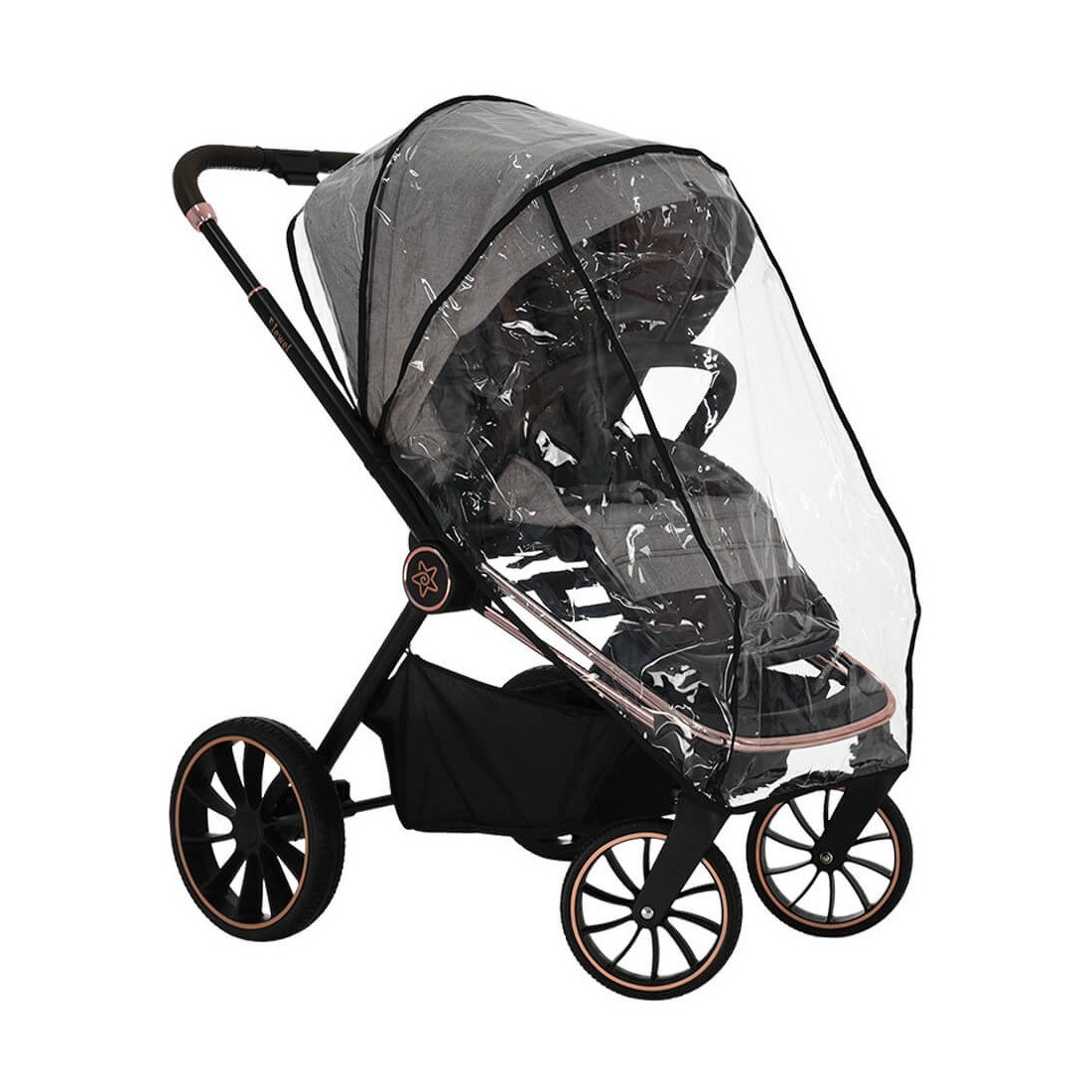 • Περιλαμβάνει ποδόσακο και αδιάβροχο, τα οποία προστατεύουν το παιδί από το κρύο και τη βροχή.