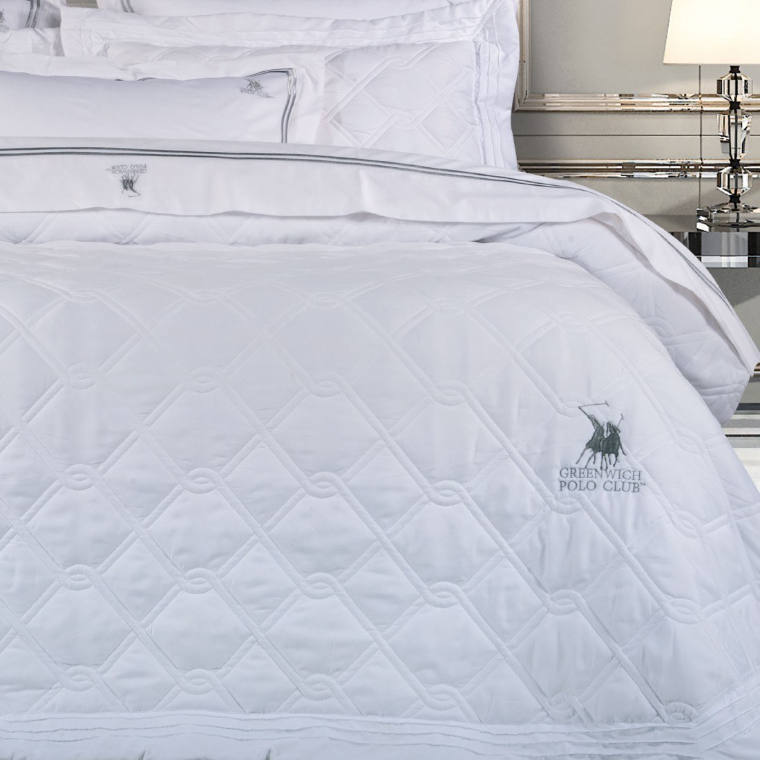 Κουβερλί σετ Greenwich Polo Club της σειράς Premium από 100% microfibre. Αυτό που χαρακτηρίζει την συλλογή είναι οι απαλές αποχρώσεις, τα διακριτικά σχέδια και το διαχρονικό ύφος. Το σετ αποτελείται από ένα κουβερλί σε διάσταση 220Χ240εκ και 2 μαξιλαροθήκες σε διάσταση 50Χ70+8εκ με περιμετρική ραφή oxford.