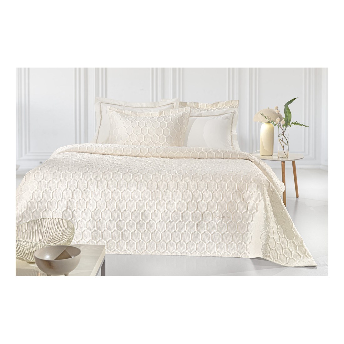 Σετ κουβερλί jacquard 3 τεμαχίων αποτελούμενο από ένα κουβερλί και δύο διακοσμητικές μαξιλαροθήκες διάστασης 50x70εκ. Το σετ είναι κατασκευασμένο από 100% microsatin με ανάγλυφο σχέδιο, ιδανικό για τους ανοιξιάτικους και θερινούς μήνες, με την υπογραφή της Guy Laroche Paris.