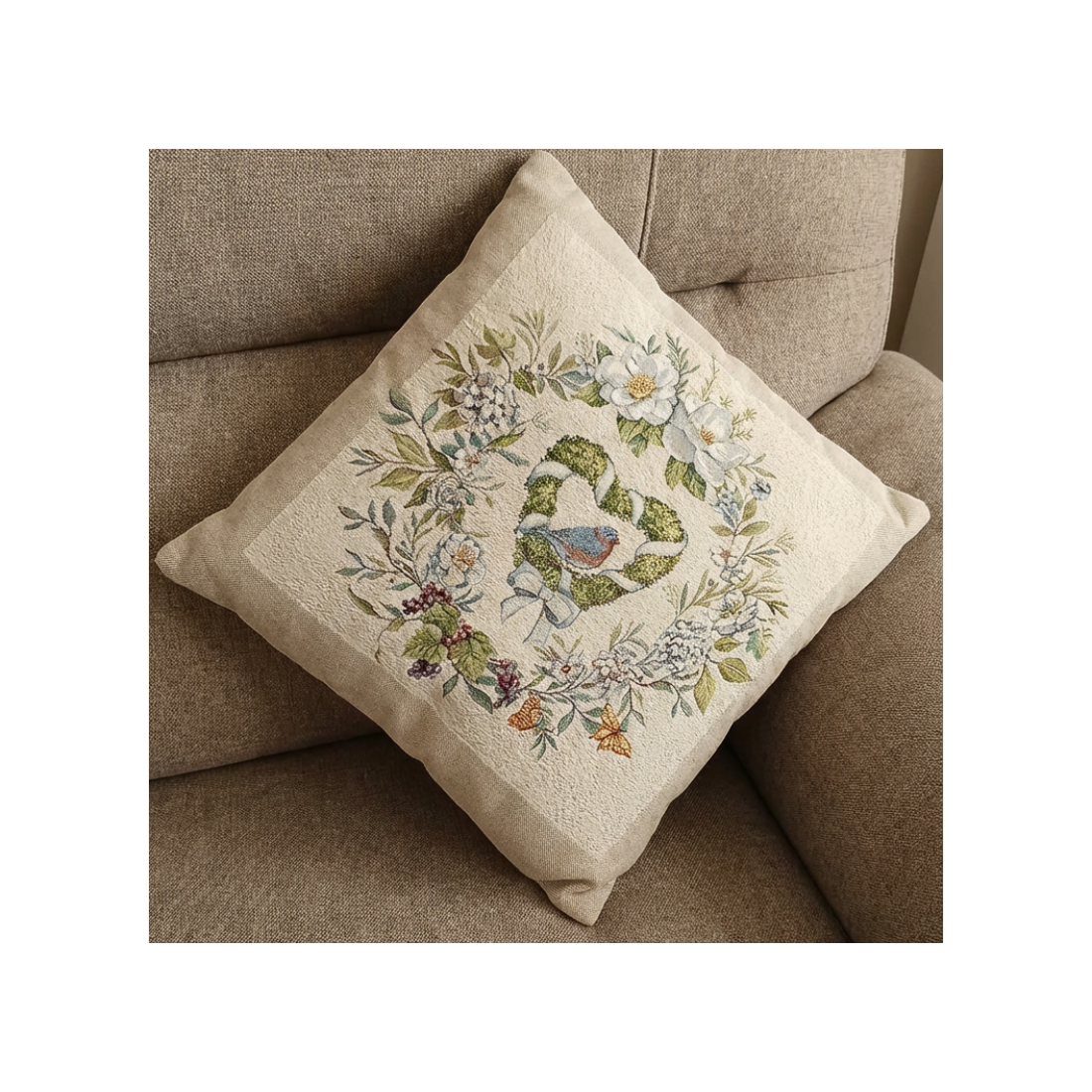 Το σχέδιο διαθέτει ένα εντυπωσιακό φλοράλ στεφάνι που περιβάλλει μια καρδιά από φυλλώματα, μέσα στην οποία αναπαύεται ένα μικρό πουλί. Η σύνθεση ολοκληρώνεται με πεταλούδες και λευκά άνθη σε κρεμ/λευκή βάση, προσφέροντας μια φωτεινή και vintage αισθητική.