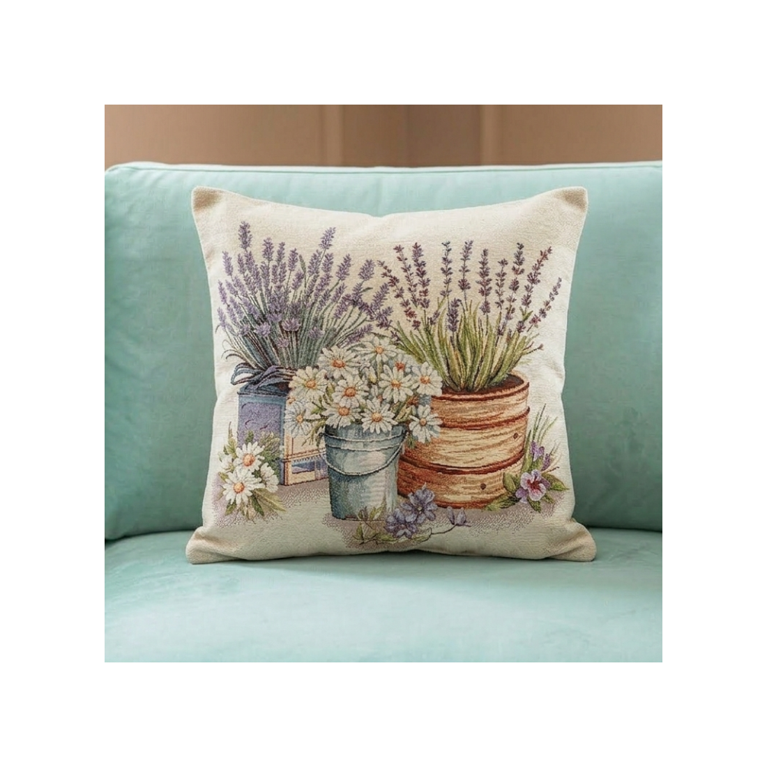 Η σύνθεση απεικονίζει γλάστρες και κουβάδες με ανθισμένες λεβάντες και μαργαρίτες. Το ρουστίκ ύφος του σχεδίου σε συνδυασμό με την κρεμ βάση του υφάσματος δημιουργεί ένα ρομαντικό αποτέλεσμα που ταιριάζει ιδανικά σε σαλόνια, βεράντες ή εξοχικές κατοικίες.