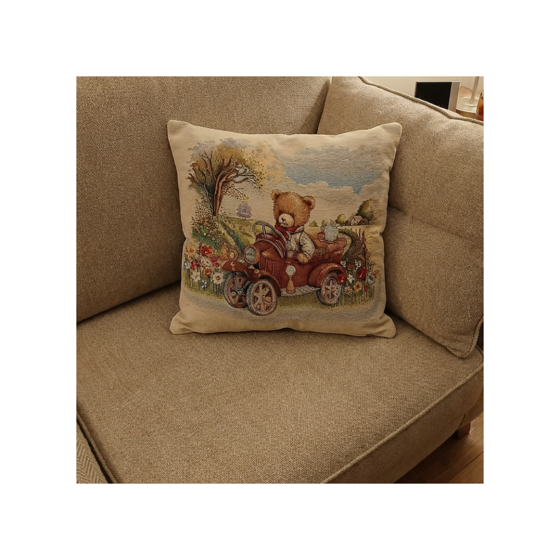 Προσθέστε μια vintage και χαρούμενη πινελιά στον χώρο σας με αυτό το μοναδικό διακοσμητικό μαξιλάρι. Η παράσταση με το αρκουδάκι σε κλασικό αυτοκίνητο αποπνέει μια νοσταλγική γοητεία, ιδανική για να ζεστάνει κάθε γωνιά του σπιτιού σας.