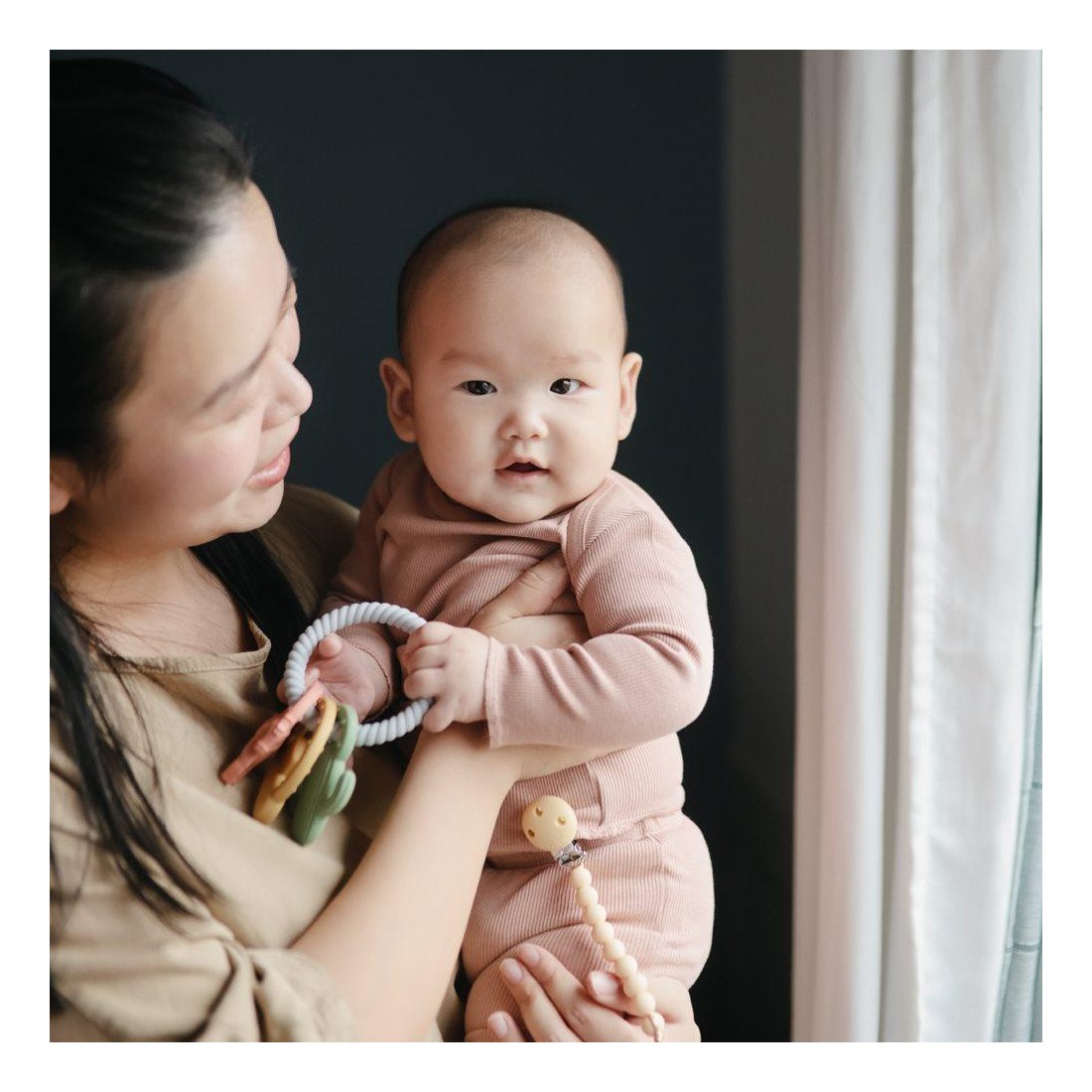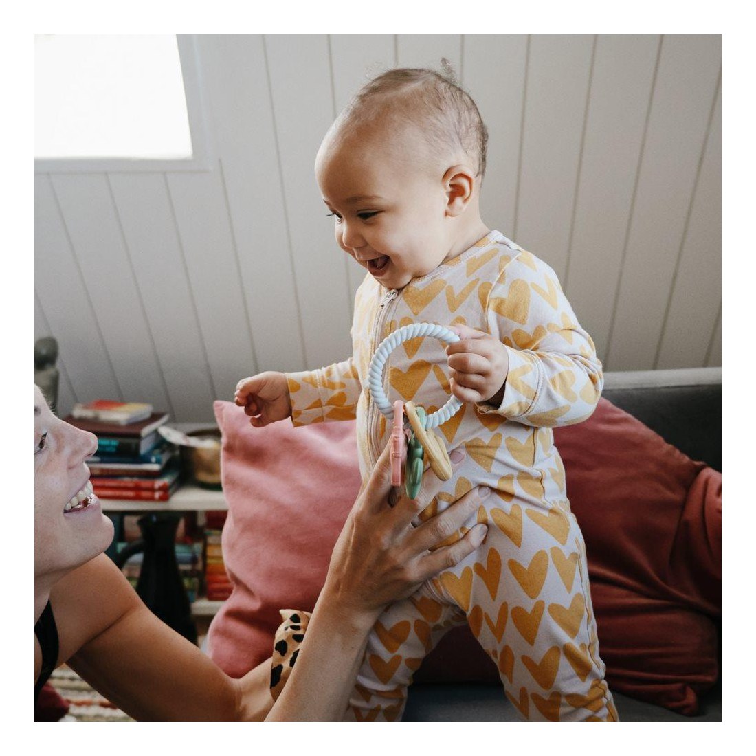 Ένας κρίκος οδοντοφυΐας με τρία μασητικά παιχνιδάκια σιλικόνης, σχεδιασμένος για να καταπραΰνει τα πονεμένα ούλα, προσφέροντας ανακούφιση στα μικρά παιδιά και ηρεμία στους γονείς! Το δακτυλίδι οδοντοφυΐας έχει διαφορετικά σχήματα και υφές, που θα διεγείρουν τις αισθήσεις των παιδιών, ενώ τα ούλα τους βυθίζονται στο μαλακή σιλικόνη. Συνιστώμενη ηλικία: 3+ μηνών. Υλικό: 100% σιλικόνη κατάλληλη για τρόφιμα Σήμανση CE Καθαρίστε το με ζεστό, σαπουνόνερο και αφήστε το να στεγνώσει στον αέρα.