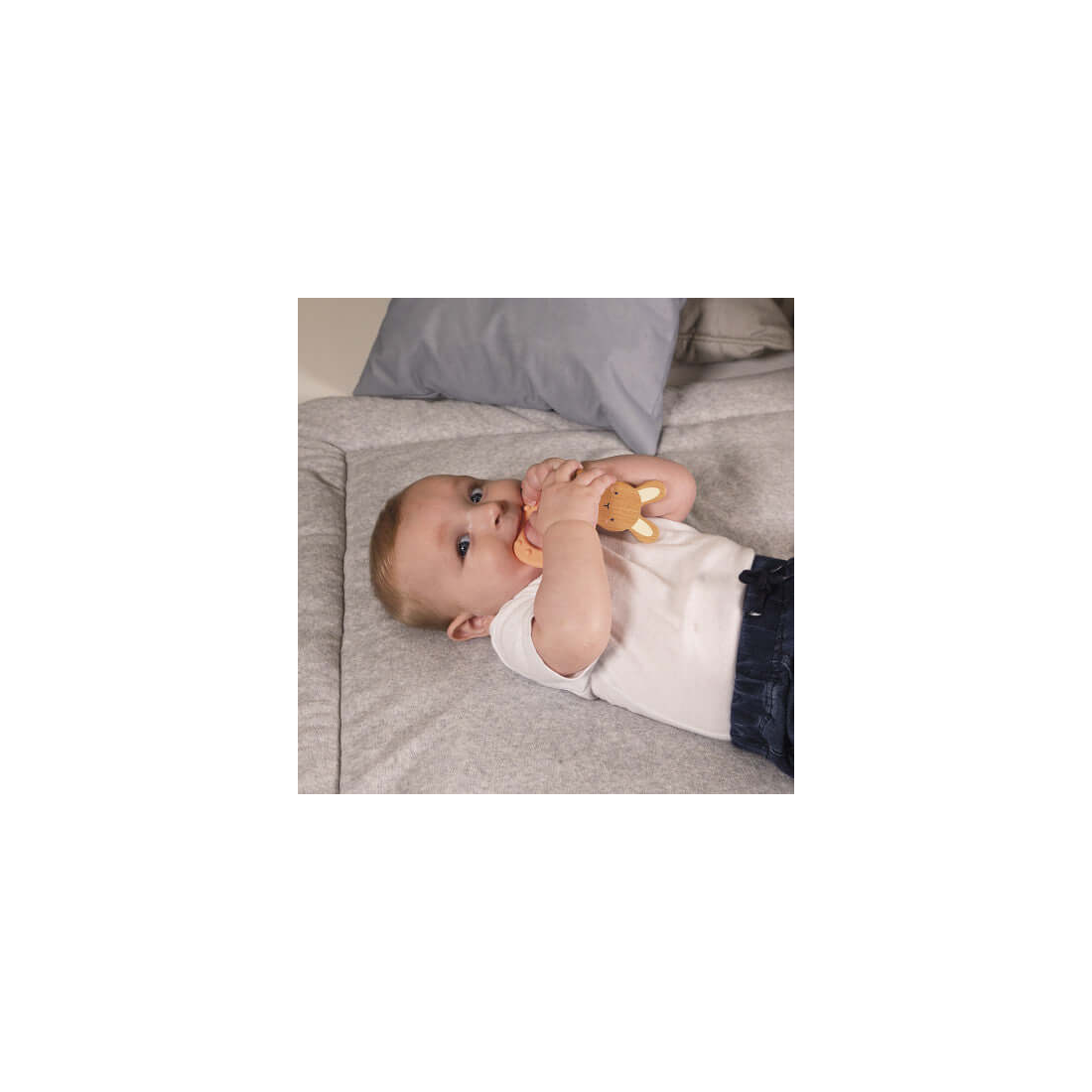 Κρίκος οδοντοφυΐας από σιλικόνη με ξύλινο ζωάκι, ιδανικός για να προσφέρει ανακούφιση στα ευαίσθητα ούλα του μωρού σας κατά την περίοδο της οδοντοφυΐας. Ο συνδυασμός της απαλής σιλικόνης με το φυσικό ξύλο δημιουργεί ένα όμορφο και λειτουργικό παιχνίδι που τραβά το ενδιαφέρον του μικρού σας.