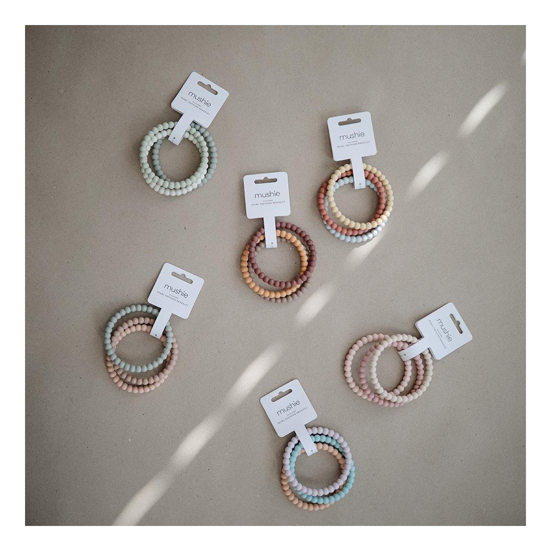 Αυτά τα όμορφα βραχιόλια μπορούν να χρησιμοποιηθούν τόσο από τη μαμά, όσο και από το μωρό. Ένα σετ από τρία μασητικά κρικάκια, τα οποία μπορείτε να φορέσετε και ως αξεσουάρ και να έχετε με έναν έξυπνο τρόπο, πάντα ένα παιχνίδι διαθέσιμο κοντά σας, όταν το μωρό τα χρειάζεται για να ανακουφίσει τα ερεθισμένα ούλα του. Τα βραχιολάκια είναι κατασκευασμένα από σιλικόνη κατάλληλη για τρόφιμα και είναι εύκολα στη λαβή, ώστε να τα πιάνουν με ευκολία όλα τα μικρά χεράκια. Είναι απολύτως ασφαλή για χρήση από μωρά. Υλικό: Σιλικόνη κατάλληλη για τρόφιμα Πλένεται και στο πλυντήριο πιάτων.