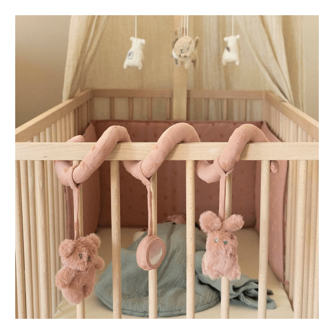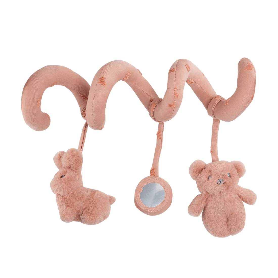 Χαρίστε στους αγαπημένους σας φίλους ένα πρακτικό και διασκεδαστικό παιχνίδι, το οποίο βοηθάει και στην ανάπτυξη των αισθήσεων του. Πρόκειται για ένα σπιράλ δραστηριοτήτων 34 cm, από απαλό στην υφή υλικό, διακοσμημένο με ανάγλυφα μικρά αρκουδάκια, το οποίο μπορείτε να τοποθετήσετε εύκολα σε διάφορα σημεία του χώρου σας. Στο σπιράλ είναι κρεμασμένα ένα μικρό καθρεπτάκι, ένα μικρό λούτρινο κουνελάκι και ένα λούτρινο μικρό αρκουδάκι, τα οποία κρατούν συντροφιά στο μωρό σας, τόσο στο δωμάτιο του και στην κούνια του, όσο και πάνω στο καροτσάκι του σε μια έξοδό σας. Υλικό: Ζακάρ από 68% βαμβάκι και 32% πολυεστέρα και συνθετική γούνα από 1005 πολυεστέρα. Πλένεται εύκολα στο πλυντήριο στους 30°. Μην χρησιμοποιείτε χλωρίνη και λευκαντικά. Στεγνώνει και στο στεγνωτήριο σε χαμηλό πρόγραμμα. Σιδέρωμα σε χαμηλή θερμοκρασία. Δεν είναι κατάλληλο για στεγνό καθάρισμα.