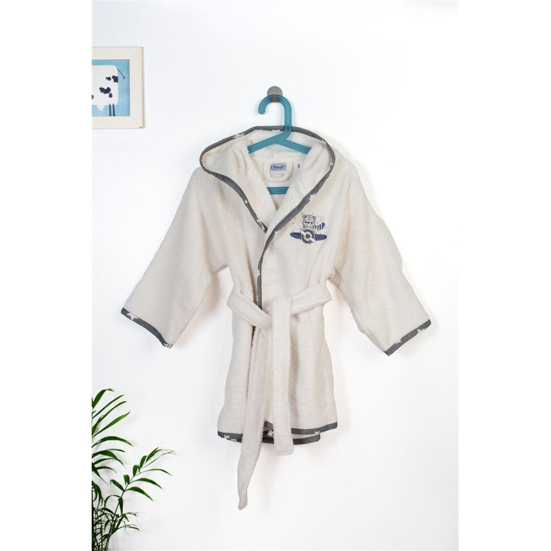 Παιδικό μπουρνούζι χρώματος εκρού με κουκούλα. κατάλληλο για ηλικίες 4-5 ετών. διακοσμημένο με χαριτωμένο κέντημα αεροπόρο και χρωματιστό ρέλι με μοτίβο αστεράκια. Κατασκευασμένο από 100% βαμβακερή υποαλλεργική πετσέτα υψηλής απορροφητικότητας. βάρους 400 gr/m² ελεγμένη για επιβλαβείς ουσίες με το παγκοσμίως αναγνωρισμένο πιστοποιητικό. OEKO TEX® Standard 100. Η απαλή και αφράτη υφή του προσφέρει την ιδανική φροντίδα μετά το μπάνιο. ενώ η ενσωματωμένη κουκούλα κρατάει το κεφαλάκι του παιδιού ζεστό. Συσκευασία δώρου: κουτί πολυτελείας.
