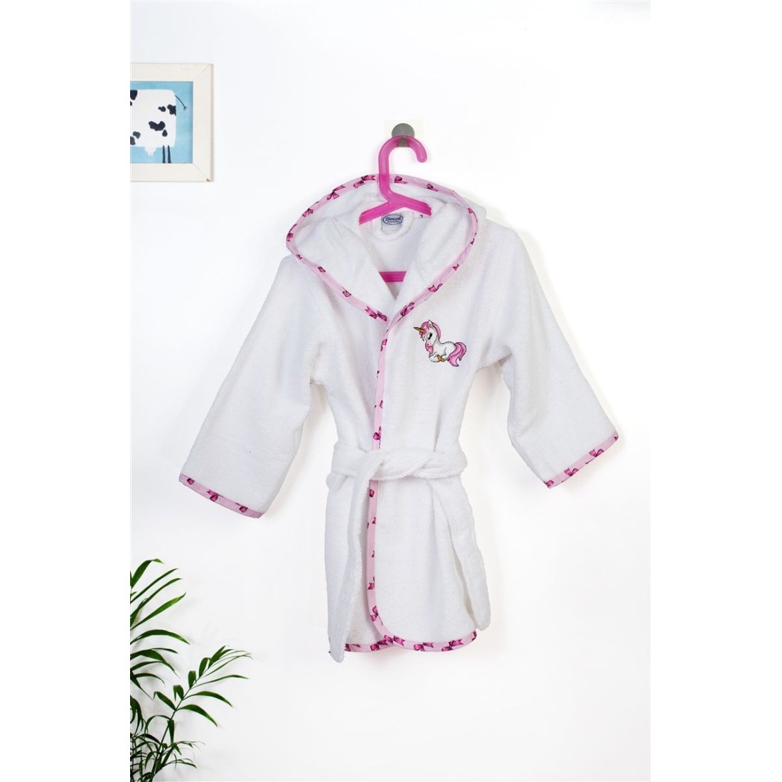 Παιδικό μπουρνούζι χρώματος λευκού με κουκούλα. κατάλληλο για ηλικίες 4-5 ετών. διακοσμημένο με χαριτωμένο κέντημα μονόκερο και χρωματιστό ρέλι με μοτίβο κορδελίτσες. Κατασκευασμένο από 100% βαμβακερή υποαλλεργική πετσέτα υψηλής απορροφητικότητας. βάρους 400 gr/m² ελεγμένη για επιβλαβείς ουσίες με το παγκοσμίως αναγνωρισμένο πιστοποιητικό. OEKO TEX® Standard 100. Η απαλή και αφράτη υφή του προσφέρει την ιδανική φροντίδα μετά το μπάνιο. ενώ η ενσωματωμένη κουκούλα κρατάει το κεφαλάκι του παιδιού ζεστό. Συσκευασία δώρου: κουτί πολυτελείας.