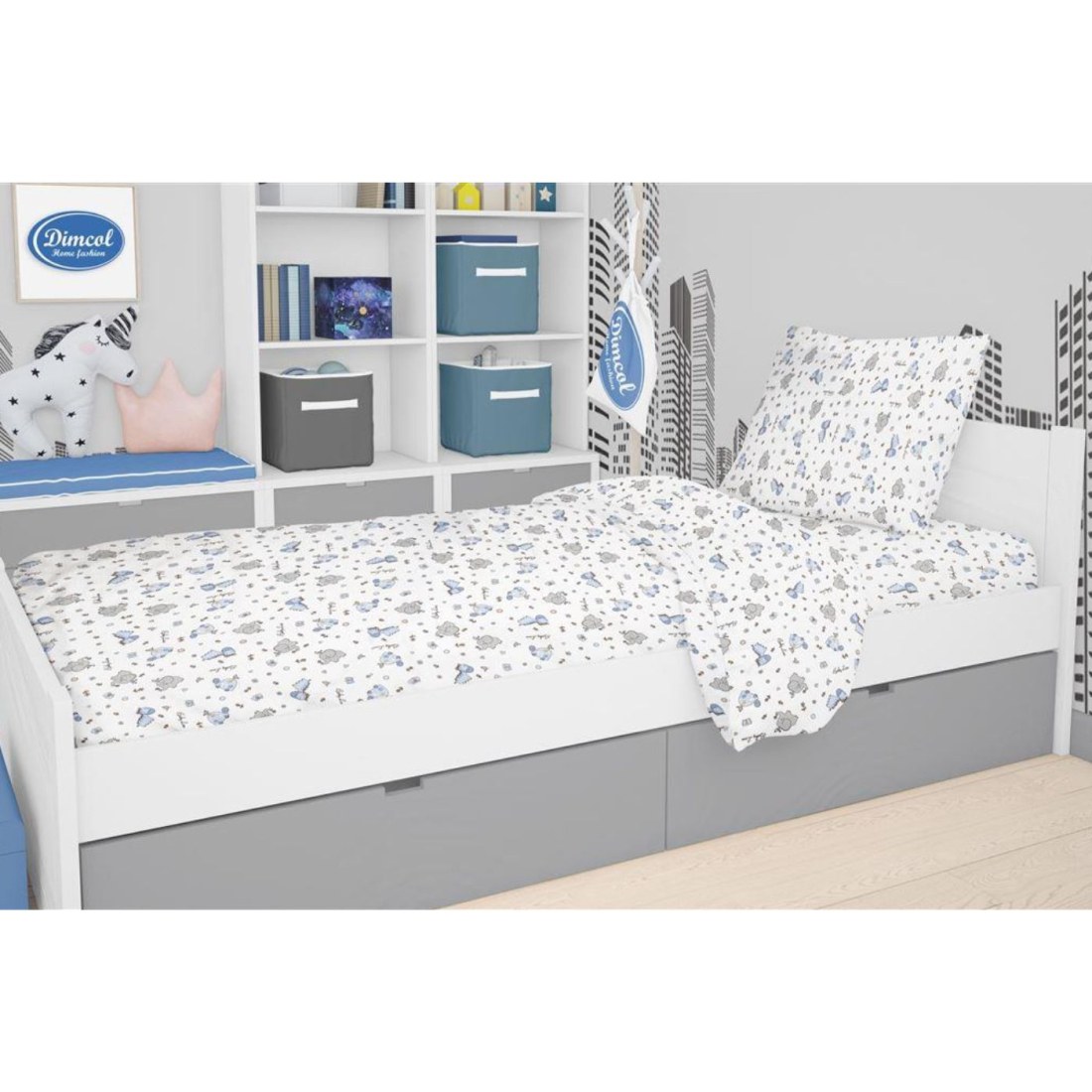 Σετ Παιδικό Σεντόνι Φανελένιο Μονό και Μαξιλαροθήκη Dimcol Elephant 074 160X240 White-Sky Blue