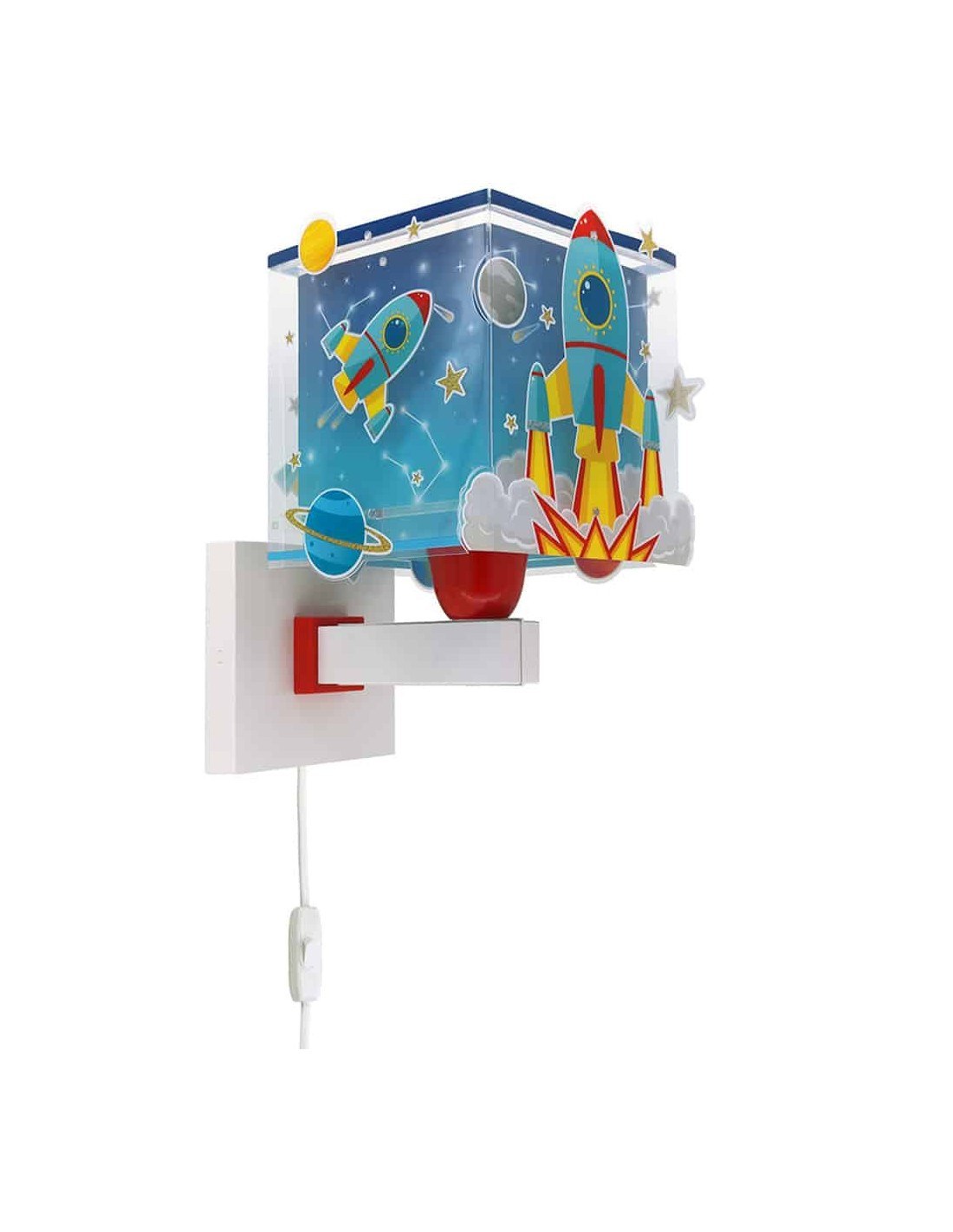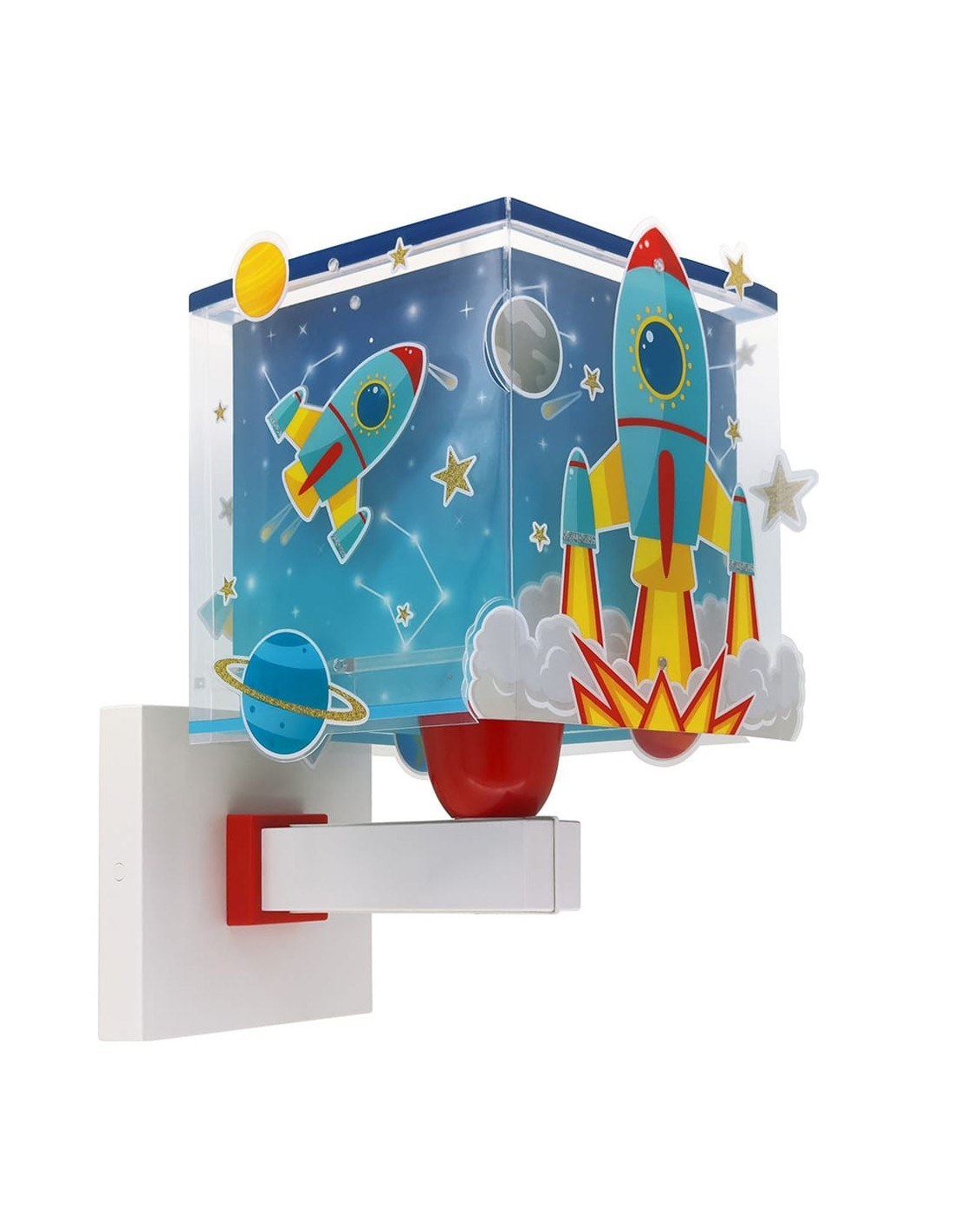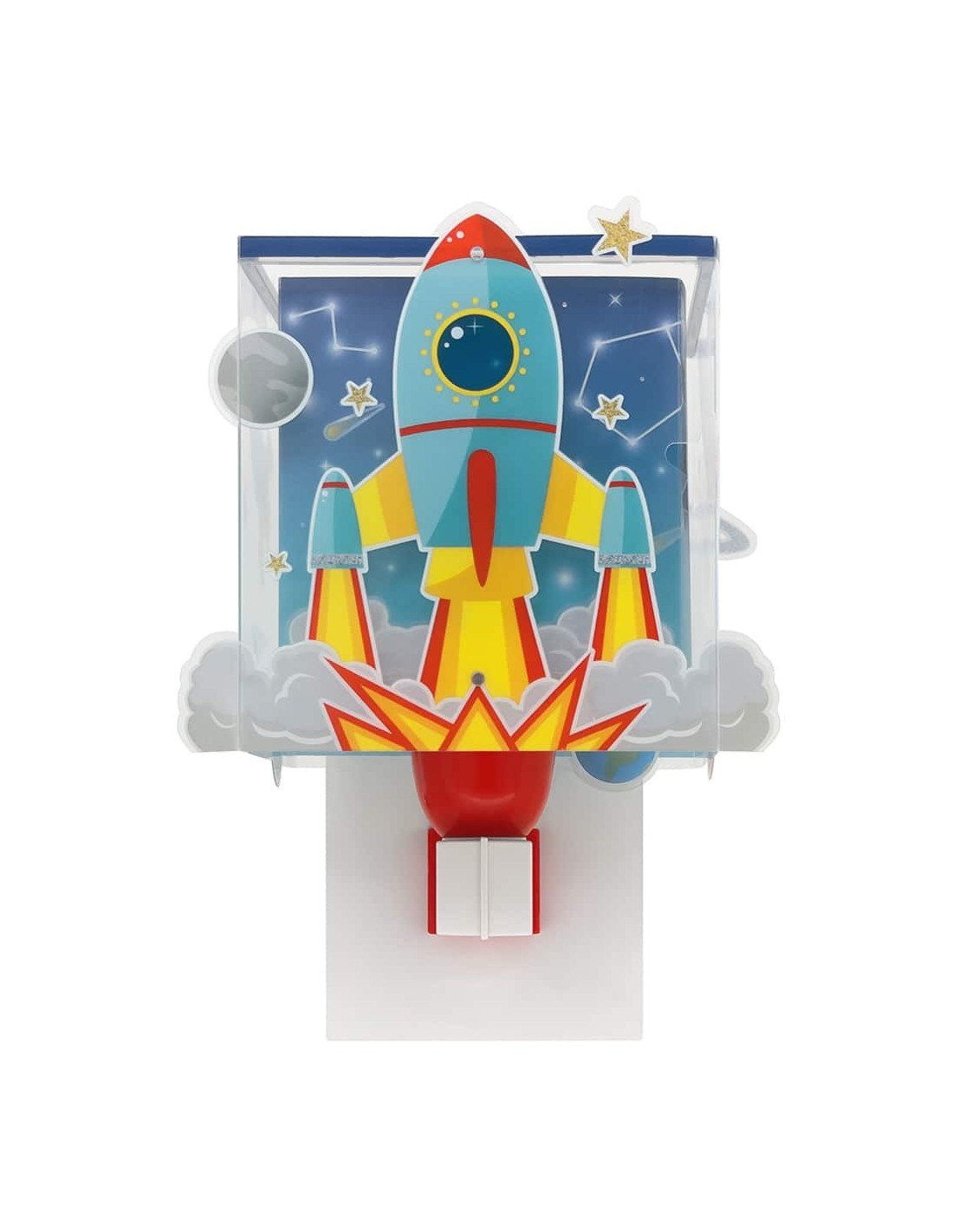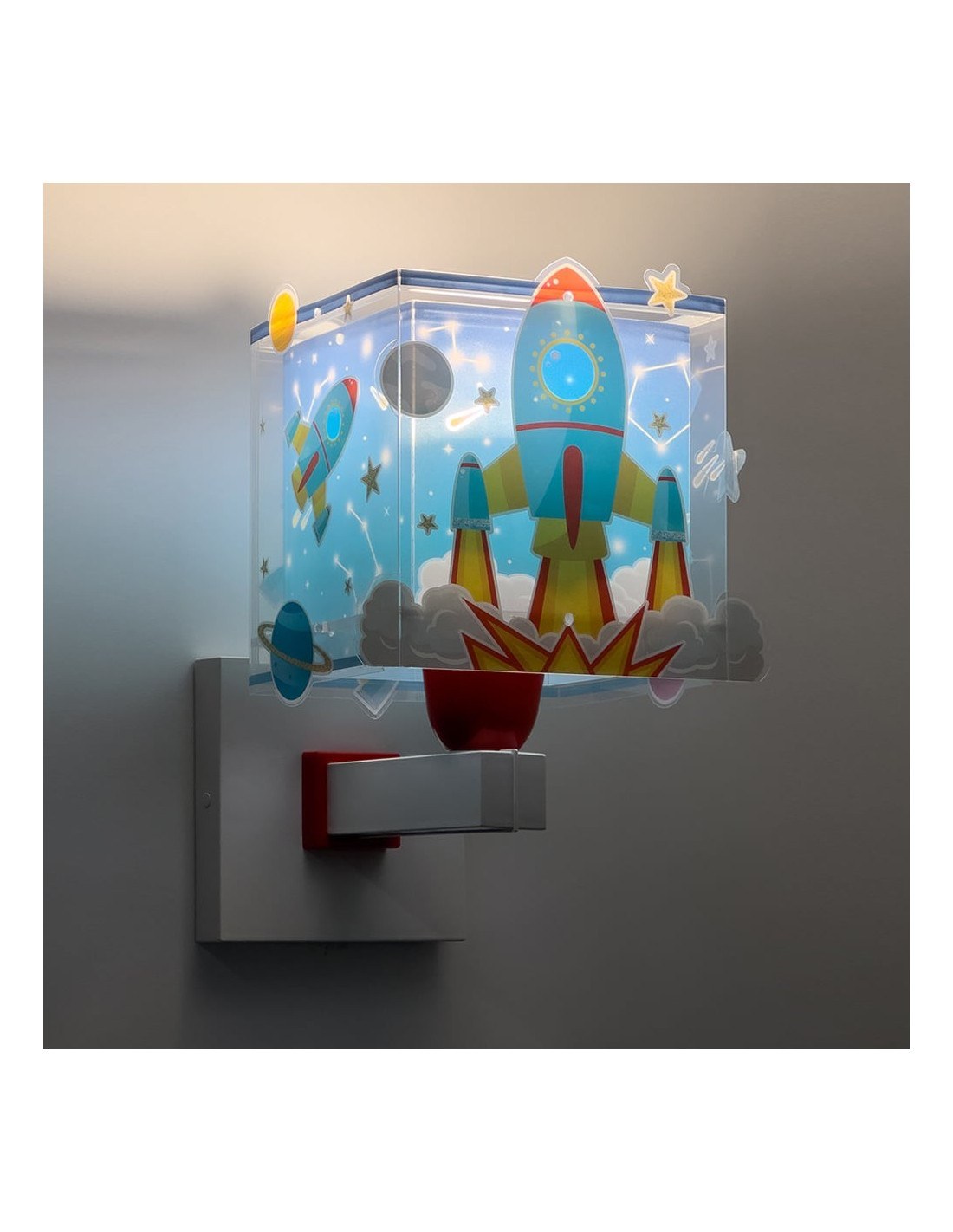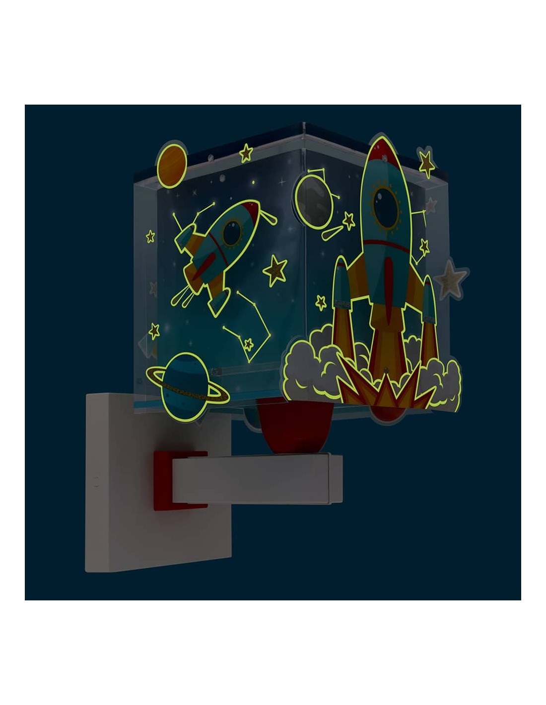 Παιδικό φωτιστικό απλίκα τοίχου με θέμα τους πυραύλους στο διάστημα, ιδανικά σχεδιασμένο για γενικό ή συμπληρωματικό φωτισμό. Η Rocket απλίκα τοίχου διπλού τοιχώματος φωτίζει και προσθέτει διασκεδαστικό χαρακτήρα και χαρούμενο άγγιγμα σε κάθε παιδικό δωμάτιο ακόμα και στο σκοτάδι με τα μαγικά φωσφορίζοντα του μέρη.