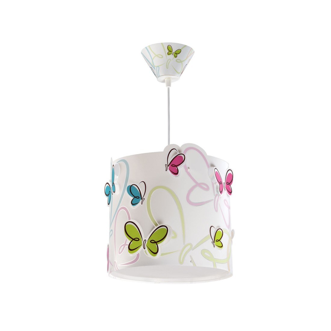 Κρεμαστό παιδικό φωτιστικό οροφής με θέμα τις πεταλούδες σχεδιασμένο για γενικό φωτισμό. Μονού τοιχώματος με διάφανο εξωτερικό τοίχωμα και πεταλούδες που εξέχουν. Συνθετικό υλικό αντοχής πολυπροπυλενίου. Κιτ ανάρτησης ρυθμιζόμενο στο ύψος και διακοσμημένη ροζέτα. Παρέχεται διαχυτής φωτός για ομοιόμορφο φωτισμό. Κατασκευασμένο εξ ολοκλήρου στην Ευρώπη. Το Butterflies φωτιστικό οροφής συμπληρώνει τα υπόλοιπα παιδικά φωτιστικά της συλλογής.