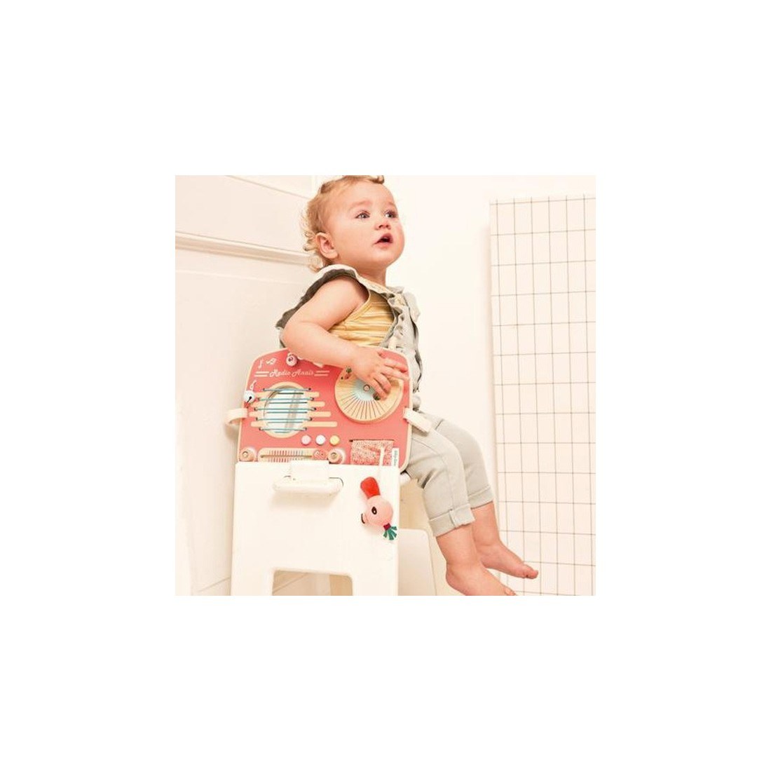 Ξύλινος πίνακας δραστηριοτήτων από τη Lilliputiens, που απεικονίζει ένα ραδιόφωνο. Προσφέρει αμέτρητες δραστηριότητες και προσαρμόζεται εύκολα στο πάρκο χάρη στις ταινίες velcro.
