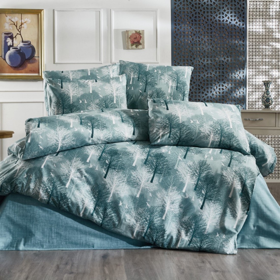 Κατασκευασμένη στην πάνω πλευρά από ύφασμα εμπριμέ σύνθεσης 70% βαμβάκι - 30% Polyester, 144 κλωστών, σε χαρούμενα και απαλά χρώματα, με μοντέρνες και σύγχρονες παραστάσεις και στη κάτω πλευρά από μονόχρωμο Petrol Shadow κομποζέ ύφασμα της ίδιας σύνθεσης για προστασία στο πάπλωμα σας και χρώματα στο κρεβάτι σας.