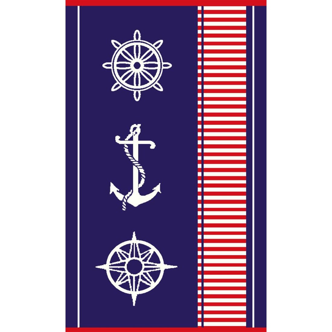 Βελουτέ πετσέτα θαλάσσης. διαστάσεων 87X165 cm. με ζακάρ σχέδιο διπλής όψεως που απεικονίζει τιμόνι. άγκυρα και πυξίδα. σε μπλε χρώμα με κόκκινες λεπτομέρειες. Κατασκευασμένη από 100% αιγυπτιακό βαμβάκι. υψηλής απαλότητας και απορροφητικότας. βάρους 420 gr/m². Συσκευασία Polybag.