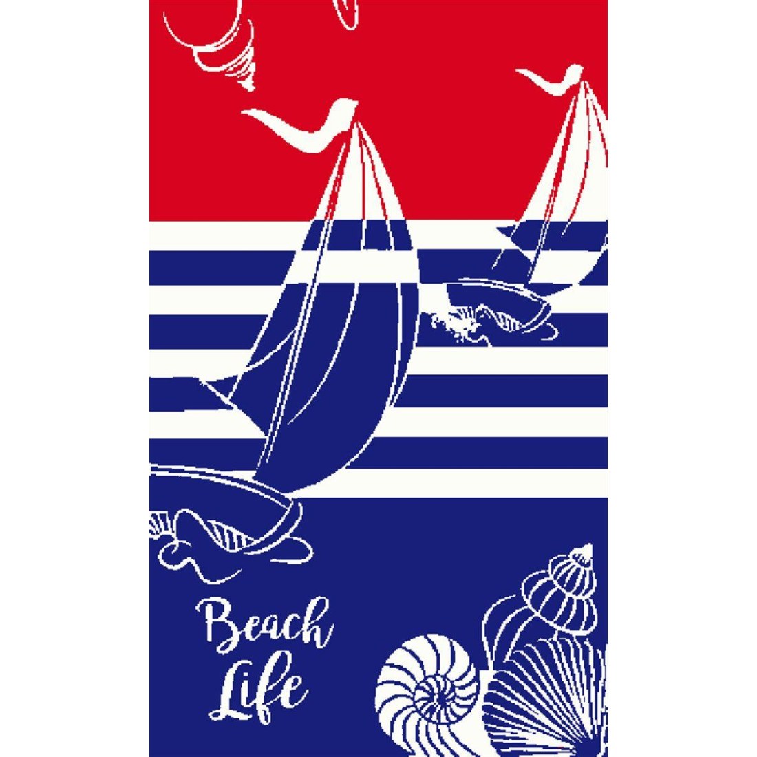 Βελουτέ πετσέτα θαλάσσης. διαστάσεων 87X165 cm. με ζακάρ σχέδιο διπλής όψεως που απεικονίζει ιστιοφόρα. σε μπλε και κόκκινο χρώμα. Κατασκευασμένη από 100% αιγυπτιακό βαμβάκι. υψηλής απαλότητας και απορροφητικότας. βάρους 420 gr/m². Συσκευασία Polybag.