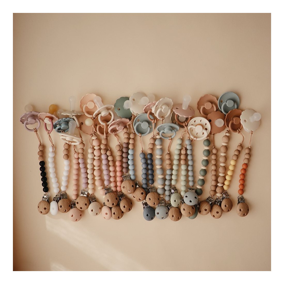 Οι διακοσμητικές χάντρες της είναι κατασκευασμένες από 100% σιλικόνη υψηλής ποιότητας, κατάλληλη για χρήση σε τρόφιμα και είναι κατάλληλες και για να της μασήσει το μωρό σας κατά τη φάση της οδοντοφυΐας.