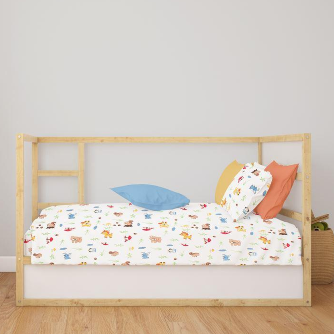 Βρεφικό σετ σεντόνια 3 τεμαχίων που περιέχει: 2 τεμ. σεντονάκια κούνιας. διαστάσεων 120X160 cm και 1 τεμ. μαξιλαροθήκη. διαστάσεων 35Χ45 cm. Κατασκευασμένο από 100% βαμβακερό φανελένιο ύφασμα. 144 κλωστών. με χαρούμενα χρώματα και μοντέρνες βρεφικές παραστάσεις. Κατασκευάζεται στην Ελλάδα. Συσκευασία Δώρου Κουτί Πολυτελείας.