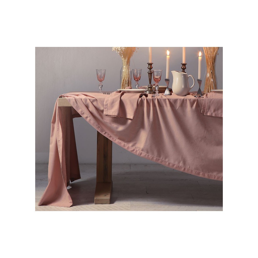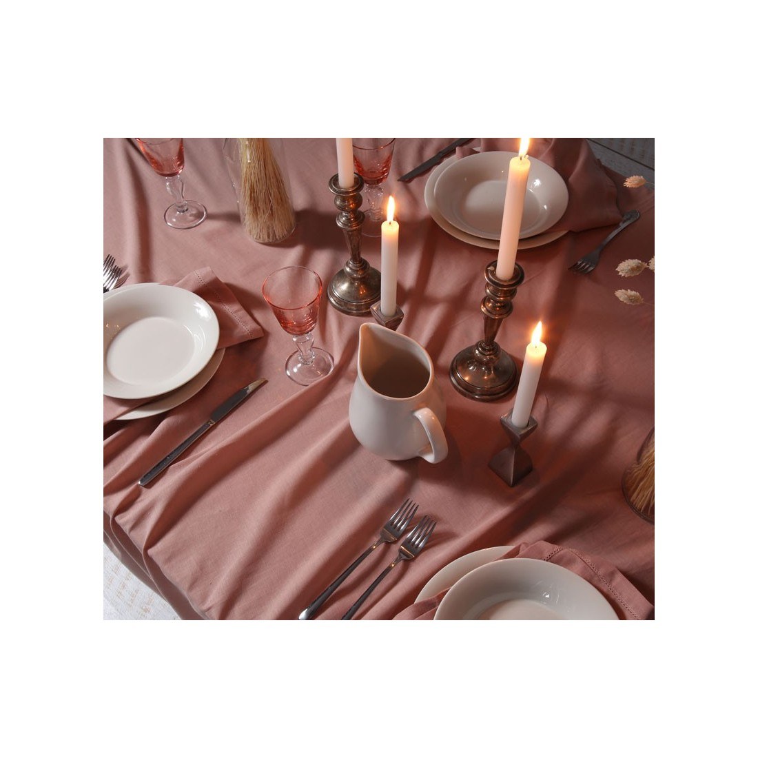 Μονόχρωμο λινό τραπεζομάντηλο με ραφή αζούρ, σε υπέροχο ροζ χρώμα. Κατάλληλο για τα επίσημα τραπέζια σας.