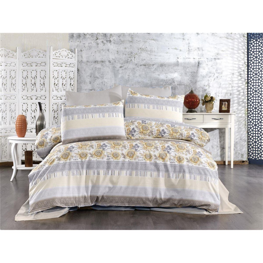 Απαλό και ζεστό Πάπλωμα Υπέρδιπλο διαστάσεων 220Χ240 cm με γέμιση βατα αντιαλλεργική 300 gsm. -Κατασκευασμένo στην πάνω πλευρά από ύφασμα Εμπριμέ σύνθεσης βαμβάκι 70% - Πολυέστερ 30%. 144 Κλωστών. σε χαρούμενα και απαλά χρώματα. με μοντέρνες και σύγχρονες παραστάσεις και στη κάτω πλευρά από Μονόχρωμο Grey κομποζέ ύφασμα Μελανζέ της ίδιας σύνθεσης. -Συσκευασία Βαλιτσάκι Polybag με φερμουάρ και χερούλι.
