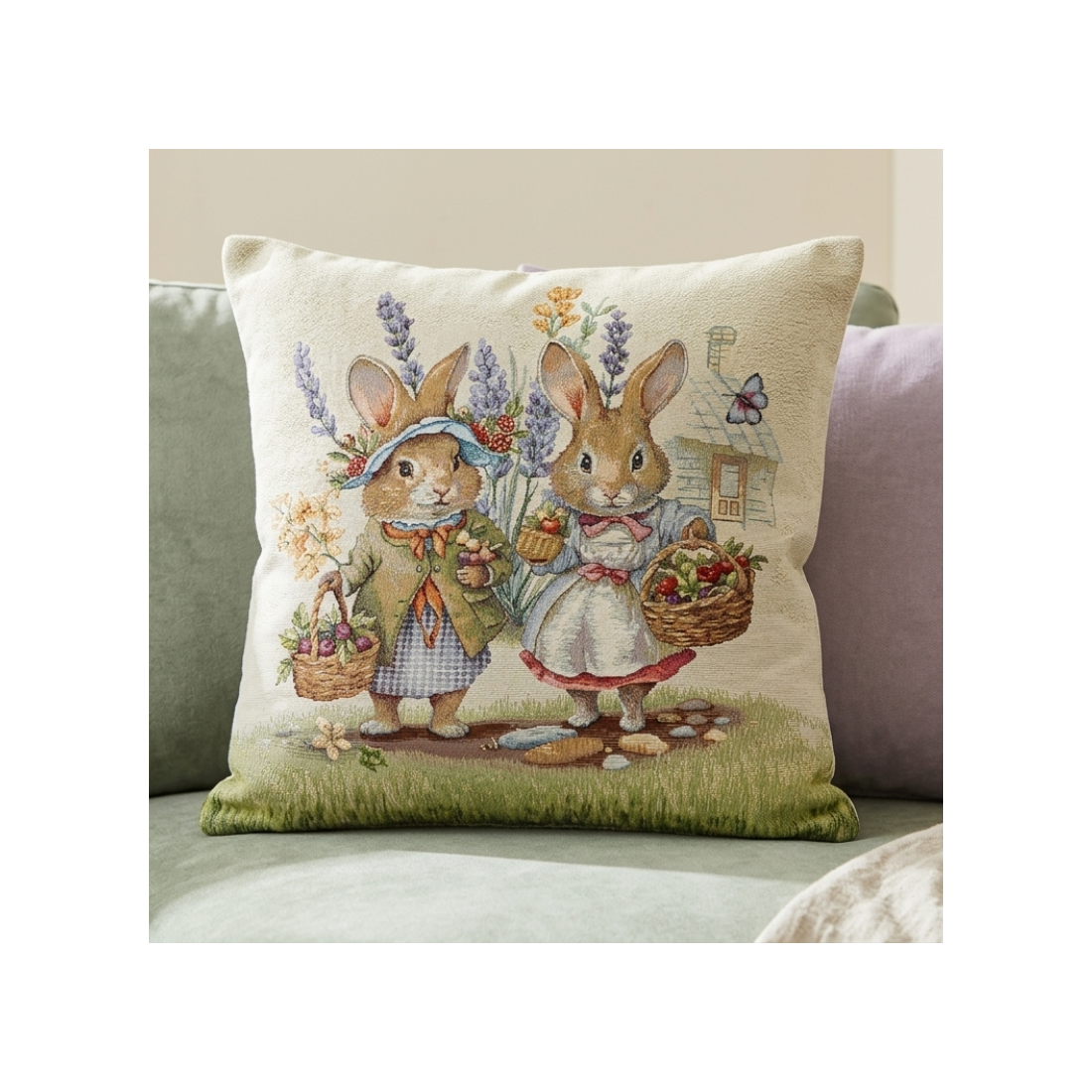 Προσθέστε μια παραμυθένια και εξοχική νότα στη διακόσμησή σας με αυτό το υπέροχο μαξιλάρι. Η παράσταση με τα δύο κουνελάκια που μαζεύουν φρούτα και λουλούδια στον κήπο αποπνέει μια αίσθηση ζεστασιάς και νοσταλγίας, ιδανική για κάθε γωνιά του σπιτιού σας.