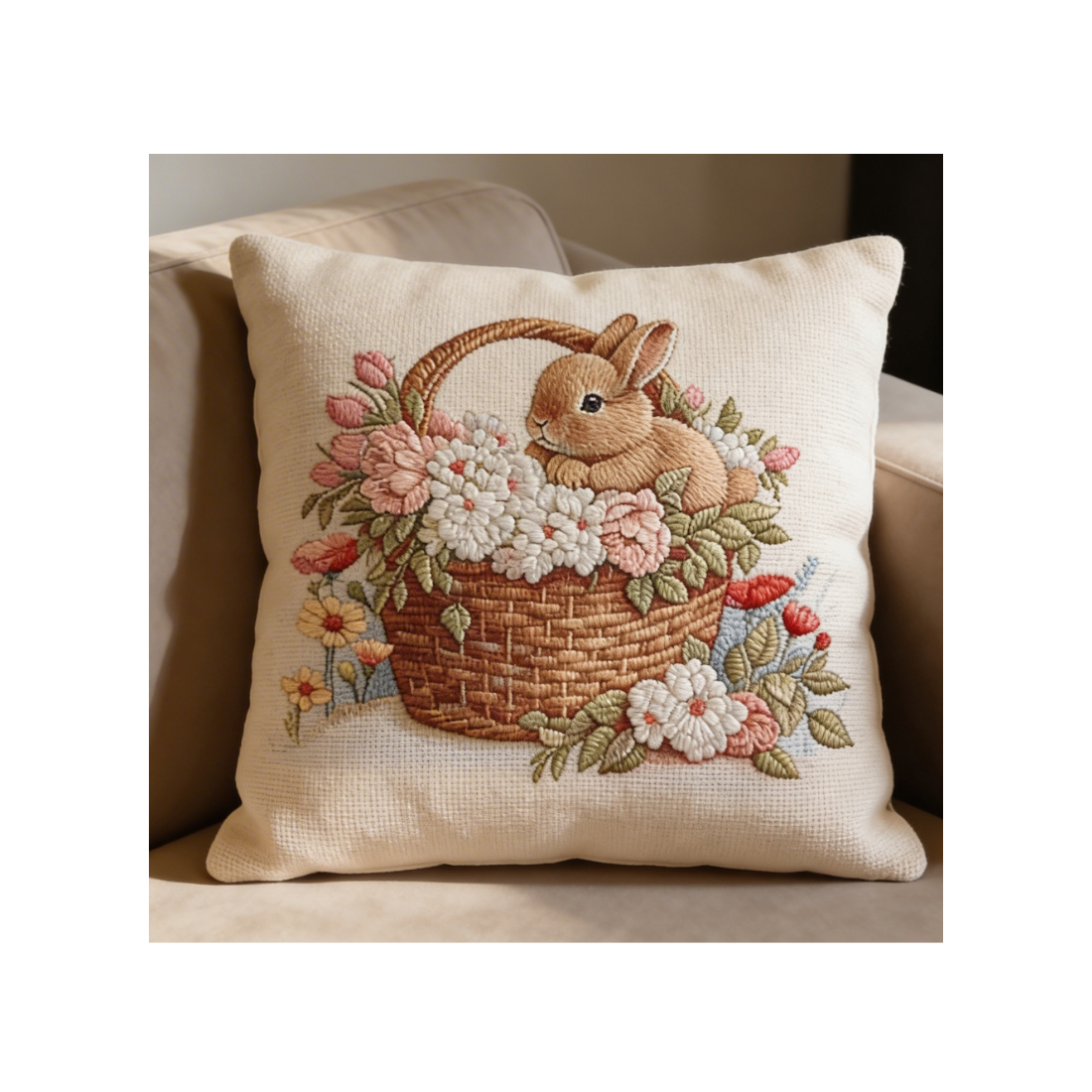Φέρτε μια γλυκιά και ανοιξιάτικη αίσθηση στο σπίτι σας με αυτό το πανέμορφο διακοσμητικό μαξιλάρι. Η τρυφερή παράσταση με το κουνελάκι μέσα στο καλάθι με τα λουλούδια δημιουργεί μια ατμόσφαιρα γαλήνης και θαλπωρής, ιδανική για κάθε δωμάτιο.