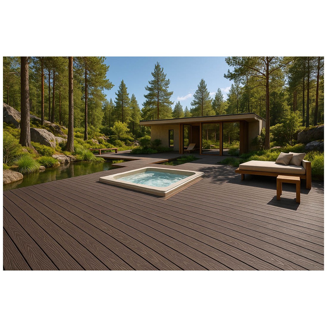 Συνθετικό δάπεδο Deck WPC νέας γενιάς εξωτερικού χώρου που αποτελείται από 55% ξύλο και 35% HDPE και 10% ρητίνες, UV σταθεροποιητές κλπ. Είναι διπλής όψης με στενό χτένι στη μία όψη και 3d ανάγλυφα νερά ξύλου από την άλλη όψη. Ιδανική επιλογή για πάτωμα πισίνας, βεράντας, εξωτερικούς χώρους καταστημάτων, κήπους, μαρίνες κλπ.