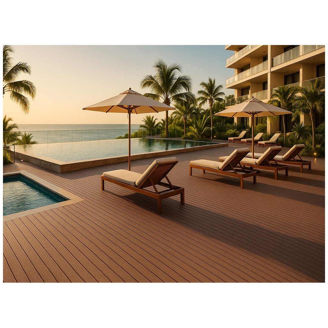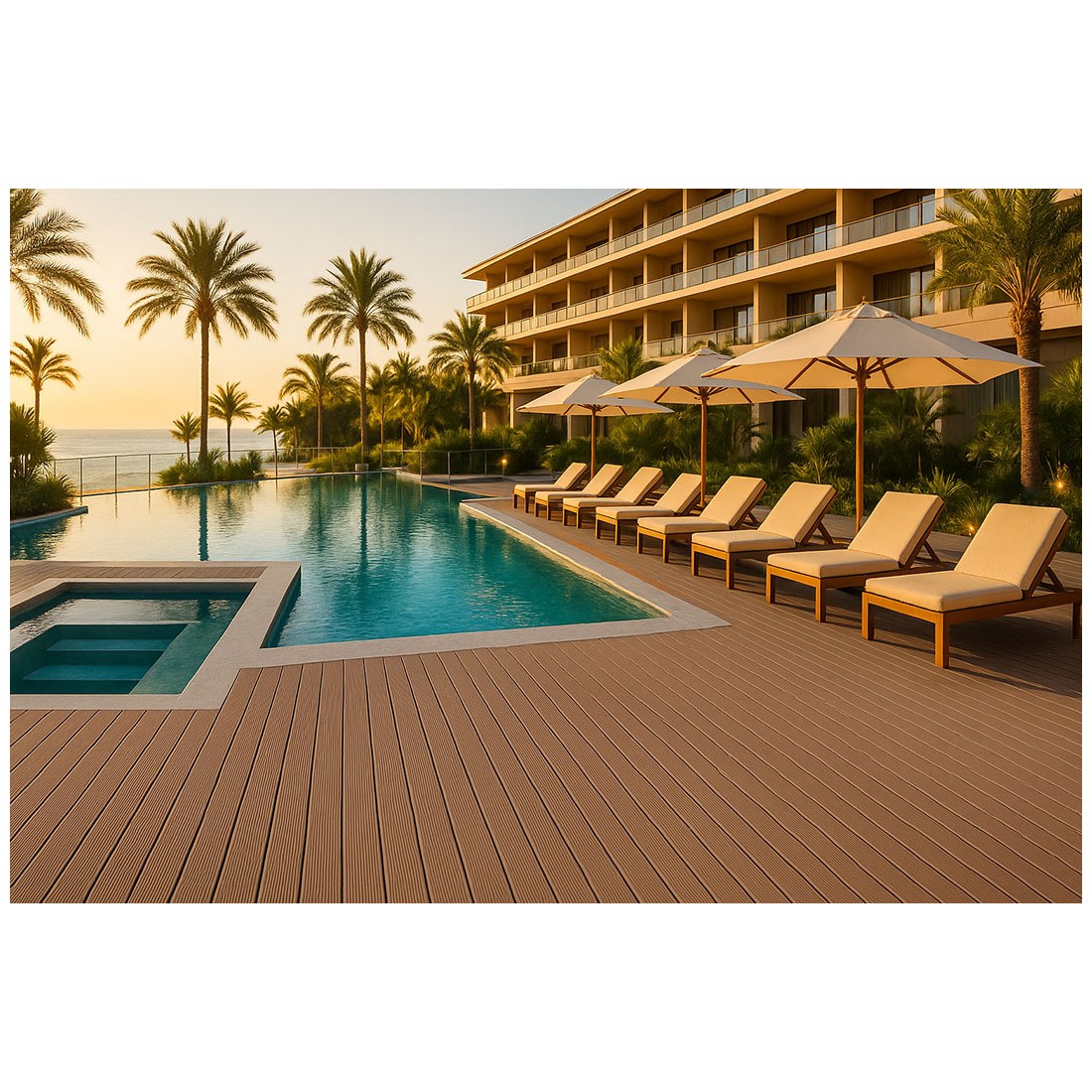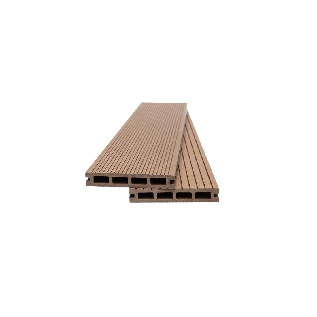Συνθετικό δάπεδο Deck WPC εξωτερικού χώρου που αποτελείται από 55% ξύλο και 35% HDPE και 10% ρητίνες, UV σταθεροποιητές κλπ. Είναι διπλής όψης με στενό χτένι στη μία όψη και φαρδύ στην άλλη. Ιδανική επιλογή για πάτωμα πισίνας, βεράντας, εξωτερικούς χώρους καταστημάτων, κήπους, μαρίνες κλπ.