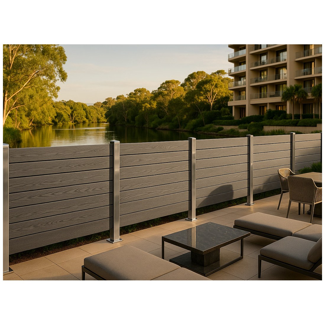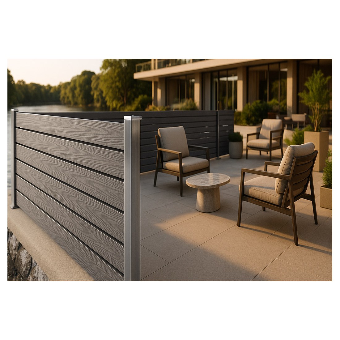 Συνθετικό Deck WPC νέας γενιάς περίφραξης εξωτερικού χώρου που αποτελείται από 55% ξύλο και 35% HDPE και 10% ρητίνες, UV σταθεροποιητές κλπ. Είναι διπλής όψης με ανάγλυφα 3D νερά ξύλου. Η περίφραξη με WPC έχει προσιτή τιμή και είναι κατάλληλη για πολλές εφαρμογές όπως περίφραξη οικοπέδου, κήπου ή πισίνας, εξωτερική περίφραξη, επένδυση τοίχου, φράχτη, αυλόπορτας κτλ.
