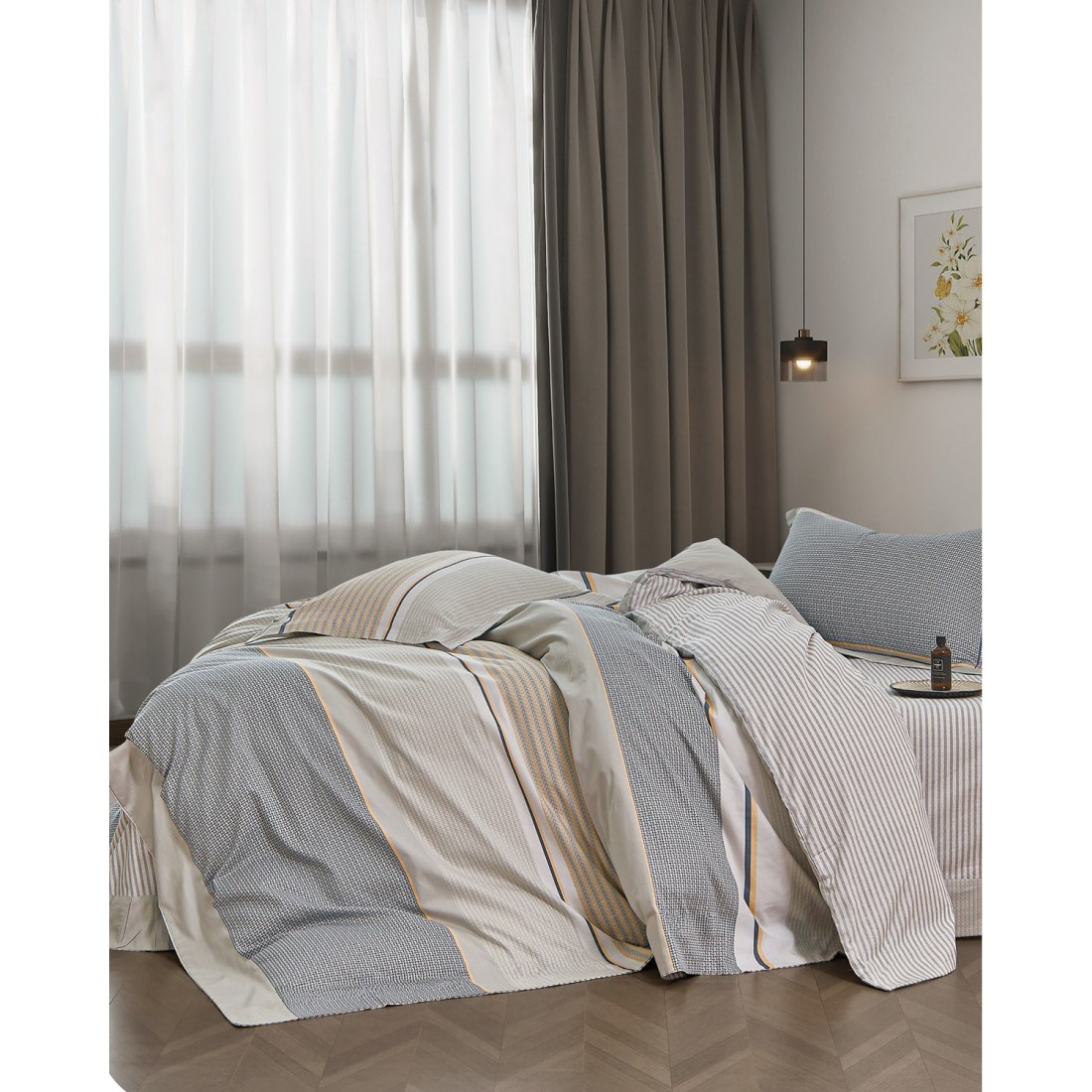 Ένα υπέρκομψο σετ υπέρδιπλων σεντονιών σε γήινες αποχρώσεις με ριγέ μοτίβο. Είναι κατασκευασμένα από 100% βαμβακοσατέν 230 κλωστών με νήματα πενιέ. που τα καθιστά εξαιρετικά μαλακά για να σας χαρίσουν τον τέλειο ύπνο. αλλά και ανθεκτικά και εύκολα στο σιδέρωμα. Η ποιότητα και το μοναδικό τους σχέδιο τους θα δώσουν στην κρεβατοκάμαρά σας ένα ξεχωριστό στυλ. Στο σετ περιλαμβάνονται και δύο μαξιλαροθήκες τύπου oxford διπλής όψης. *Το σχέδιο στις μαξιλαροθήκες ενδέχεται να διαφέρει από αυτό της φωτογραφίας. καθώς η εταιρεία παράγει μαξιλαροθήκες από όλο το σχέδιο του υφάσματος και τις συσκευάζει με τυχαία σειρά. ** Συνδυάστε τα με τα υπόλοιπα είδη του ιδίου σετ για ένα ολοκληρωμένο αποτέλεσμα. ΦΡΟΝΤΙΔΑ/ ΟΔΗΓΙΕΣ ΠΛΥΣΗΣ Πλύσιμο σε μέγιστη θερμοκρασία νερού 40C. Απαγορεύεται η χρήση λευκαντικών ουσιών ή χλωρίνης.